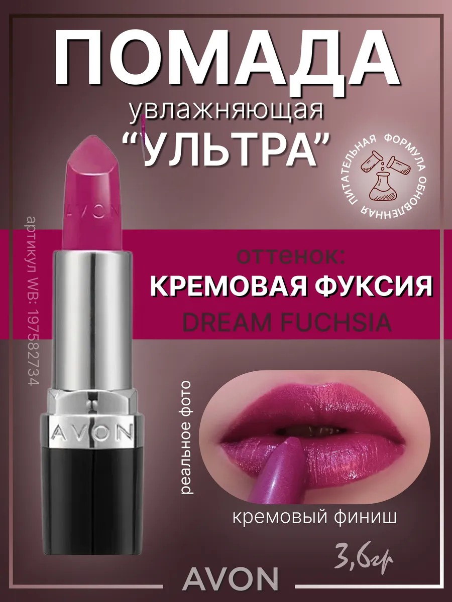 Ультра - это увлажняющая кремовая помада от Эйвон, за счет которой ваши губы будут максимально увлажнены и выглядеть красиво на протяжении всего дня. Она представлена в 30 восхитительных оттенках с различными финишами, что позволяет создать уникальные эффекты на губах. Воспользуйтесь этой уникальной возможностью и достигните безупречного макияжа с помадой AVON Ультра DREAM FUCHSIA кремовая фуксия!