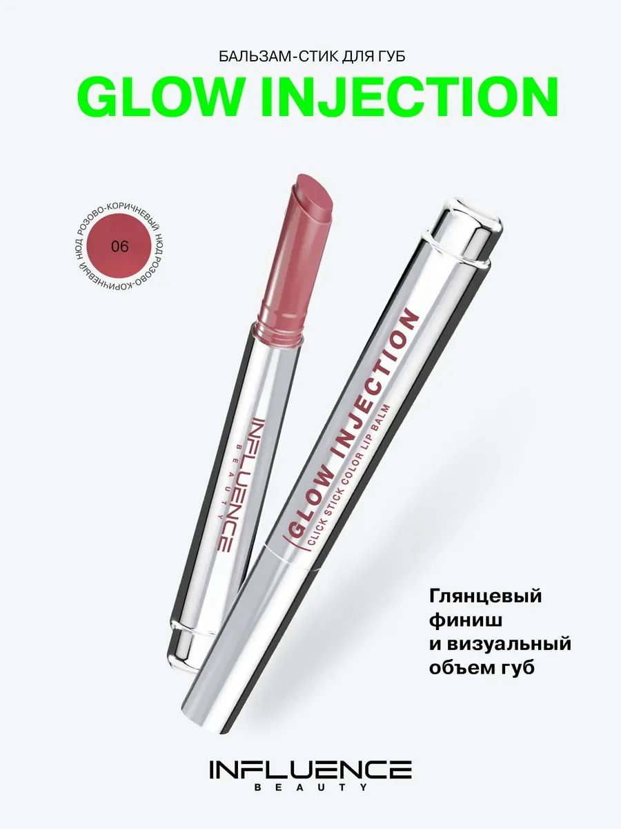 Glow Injection Lip Balm Stick, Pink Brown, 06, is an innovative hybrid product with a raspberry scent that makes lips incredibly glossy, attractive, smooth, and visually plumper. Beeswax and vitamin E in the Glow Injection lipstick-balm nourish the skin, leaving it soft and smooth. The universal translucent shade with a radiant finish suits any look and mood, and the weightless texture allows you to achieve the desired effect – from a light, translucent finish to a more intense, dazzling finish. This set features a nourishing, moisturizing formula, making it an ideal choice for women's cosmetics. The innovative click-stick mechanism allows for precise product dosing and ensures even distribution of the balm. This decorative cosmetic for women is also ideal for creating a variety of looks: from nude to vibrant lipsticks for a stylish and beautiful makeup look. With Glow Injection, your lips will look well-groomed!