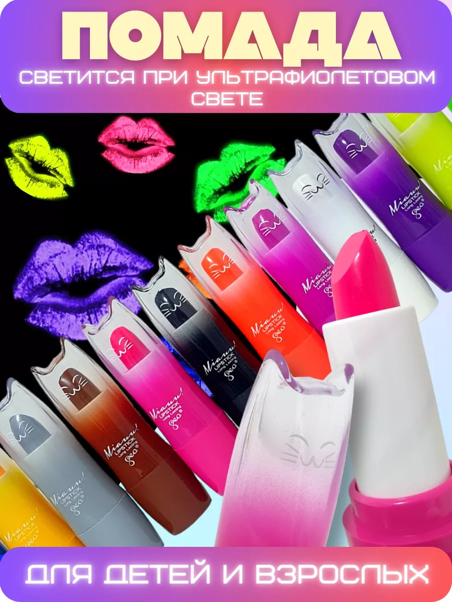 Хотите быть звездой любой вечеринки? Тогда помада для губ неоновая светящаяся набор из 12 цветов - идеальный выбор для создания яркого и запоминающегося образа! Набор помад подойдет для любого случая: будь то праздник, вечеринка, фотосессия или поход в ночной клуб. Модные идеи для макияжа включают в себя тематику индии, фей, космоса и сюрреализма. Помада легко ложится на губы, имеет приятную бархатистую текстуру, не скатывается. Помимо большой палитры оттенков, у этой помады есть еще одно удивительное свойство - она начинает ярко светиться под ультрафиолетовым светом! Хотим подчеркнуть что помада светится в темноте, но только при УФ свете. Легкая текстура обеспечивает плотное, нежное и легкое нанесение цвета. Гипоаллергенна, не наносит вреда здоровью, безопасна для детей. Выберите свой оттенок из 12 ярких цветов сезона или наносите сразу несколько цветов для создания разнообразных образов. Подарочная упаковка и красивые футляры в форме котиков позволяют преподнести отличный подарок на любой праздник для вашей дочери, сестры, девушки, жены, любимой, коллеги или подруги. Выделяйтесь и создавайте неповторимый макияж с помощью ультрафиолетовой помады!