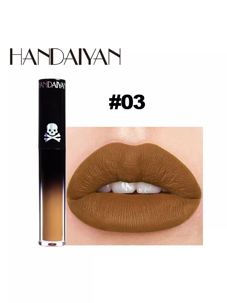 Liquid matte lipstick from Handaiyan. It's very dense—super matte—mega-long-lasting and waterproof. It has a pleasant scent. After applying the lipstick, wait a minute without pressing your lips together until it dries completely. The texture will become maximally matte, and the stickiness will disappear. It doesn't dry out lips or tighten skin. We recommend removing the lipstick with hydrophilic oil. All cosmetics are delivered fresh directly from the factory. All deliveries are from 2023. The expiration date is 3 years from the date of manufacture. The highly pigmented shade completely covers lip color with the first coat, and the convenient applicator ensures even application. This matte lipstick is available in a wide range of shades. Velvety, dense coverage is guaranteed!