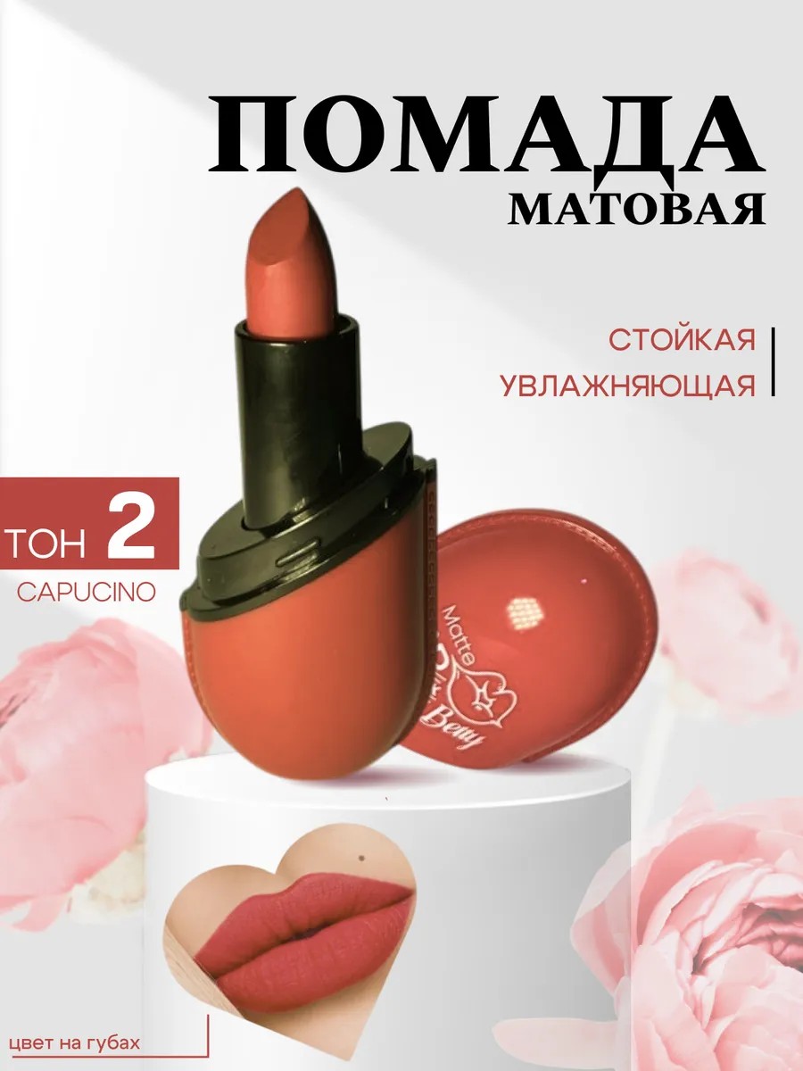 Miss Betty Matte Cream Lipstick, shade 02 capucino, glides on perfectly and creates a soft, powdery finish that doesn't feather or smudge. This beige, peach velvet lipstick provides maximum comfort and instantly gives lips the perfect, rich, nude color.