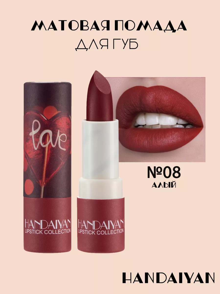Увлажняющая матовая губная помада от HANDAIYAN. Имеет бархатную текстуру, приятно ощущается на губах и не сушит их. Обеспечивает плотное матовое покрытие губ. В палитре этой помады есть как нежные оттенки, так и глубокие яркие цвета.