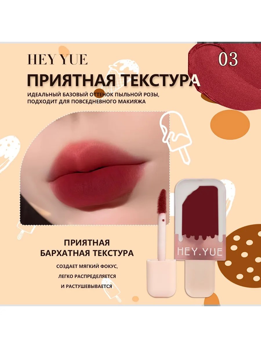 Тинт для губ с бархатной текстурой идеально подойдет не только для вечернего макияжа, но и для повседневной нюдовой гаммы. Мягкая и гигиеническая формула помады даст увеличение объема губ без ощущения сухости и дискомфорта. Представленную базу декоративной косметики можно наносить после использования маски и бальзама. Это отличный вариант для создания дерзкого контуринга и формы губ к летнему образу. Перламутровый флакон в виде мороженки в подарочной упаковке приведет в восторг любую девочку – подростка, молодую девушку или взрослую женщину. Косметический продукт в ярких оттенках найдет применение в разном макияже. Это достойная альтернатива китайскому тинту. Помада с органическими маслами станет любимым средство для ухода в холодный период времени и поможет достичь мерцающего эффекта. Профессиональная корейская губная помада карандаш доступна в суперстойкой версии, которая создает ровное покрытие, обеспечит увлажнение, восстановление и питание губ.