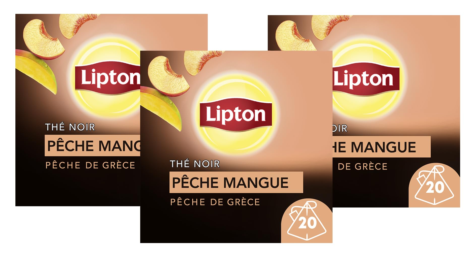 Looking for something new? Imagine a fruity, intense, and flavorful experience. Experience a cocktail combining the sweetness of mango, the velvety texture of peach, and black tea leaves swirling in a Pyramid tea bag. A perfectly balanced taste to thrill you. The tea leaves in this box have been picked from Rainforest Alliance Certified farms and carefully selected to offer you high-quality tea. They have then been carefully packaged in Pyramid tea bags to allow them to fully unfurl and release their full flavor. For the perfect brew, pour 200 ml of water at 90 C, without milk or sugar, and let your black tea steep for 2 to 3 minutes, depending on your desired strength. Lipton is committed to sustainable development with its Rainforest Alliance certification. All Lipton tea comes from Rainforest Alliance Certified farms, ensuring a tea that is kinder to farmers and the environment. Lipton is committed to supporting smallholder farmers through its sustainability policy. Our story: When Sir Thomas Lipton founded his company at the end of the 19th century, he bought his first tea plantation in Ceylon (Sri Lanka). More than a hundred years later, Lipton owns thousands of hectares of quality tea bushes in East Africa. Built on over a century of experience in growing and blending tea, Lipton has retained Sir Thomas's passion for innovation and excellence. Lipton is founded on strong values ??inspired by its founder: naturalness, optimism, and dynamism. In this spirit of inventiveness, research, and discovery, Lipton helps people discover the benefits of brewed tea, whether black or green. A modern brand that breaks away from the traditional codes of "tea time," Lipton has built its success on developing a "tasting experience" based on moments of shared pleasure, discovery, and conviviality. All Lipton tea comes from Rainforest Alliance Certified farms, ensuring a tea that is kinder to farmers and the environment. Instructions: Pour 200 ml of water at 90 C, without milk or sugar, and let your black teas steep for 2 to 3 minutes, depending on the desired strength.Lipton black tea leaves come from Rainforest Alliance Certified farms. The Pyramid tea bag, developed by Lipton, allows all the ingredients to generously release their natural aromas, letting you enjoy all the pleasures of tea. For a perfect brew, pour 200 ml of water at 90 C, without milk or sugar, and let your black teas steep for 2 to 3 minutes, depending on the desired strength. Enjoy Lipton Peach Mango Black Tea and discover a delicious blend of the sweetness of mango, the velvety texture of peach, and black tea leaves. All the expertise of Sir Thomas Lipton is captured in 20 peach and mango tea bags with a perfectly balanced flavor for a truly delightful experience. The 20 Pyramid bags of Lipton Citrus Black Tea offer a fruity, intense, and flavorful experience.Description du produit Envie de nouveauté ? Imaginez une expérience fruitée, intense et savoureuse. L'expérience d'un cocktail alliant la douceur de la mangue, le velouté de la pêche et des feuilles de thé noir tourbillonnant dans un sachet Pyramid . Un goût parfaitement équilibré pour frissonner de plaisir. Les feuilles de thé présentes dans cette boîte ont été cueillies dans les plantations certifiées Rainforest Alliance et sélectionnées avec attention pour vous offrir du thé de grande qualité. Elles ont ensuite été soigneusement emballées dans des sachets Pyramid pour s'épanouir librement et libérer toutes leurs saveurs. Pour une dégustation parfaite, versez 200 ml d'eau à 90 C, sans lait ni sucre et laissez infuser votre thé noir pendant 2 à 3 mn selon l'intensité désirée. Lipton est engagé dans la filière du développement durable avec sa certification Rainforest Alliance. La totalité du thé Lipton provient de plantations certifiées Rainforest Alliance pour un thé plus respectueux des cultivateurs et de l'environnement. Lipton s'est engagé à soutenir les petits exploitants agricoles à travers sa politique durable. Notre histoire : Quand Sir Thomas Lipton fonda sa société à la fin du 19? siècle, il acheta sa première plantation de thé à Ceylan (Sri Lanka). Plus de cent ans après, Lipton possède des milliers d'hectares de théiers de qualité en Afrique orientale. Bâti sur une expérience de plus d'un siècle en matière de culture et de mélange de thé, Lipton a conservé l'amour de Sir Thomas pour l'innovation et l'excellence. Lipton s'appuie sur des valeurs solides inspirées par son fondateur : naturalité, optimisme et dynamisme. Dans cet esprit d'inventivité, de recherche et de découverte, Lipton contribue à faire découvrir les bienfaits du thé infusé, thé noir ou thé vert. Marque moderne et éloignée des codes traditionnels du « tea-time », Lipton a fondé son succès sur le développement d'une « expérience de dégustation » basée sur des moments de plaisirs partagés, de découvertes et de convivialité. La totalité du thé Lipton provient de plantations vérifiées Rainforest Alliance pour un thé plus respectueux des cultivateurs et de l'environnement. Mode d'emploi Versez 200 ml d'eau à 90 C, sans lait ni sucre et laissez infuser vos thés noirs pendant 2 à 3 mn selon l'intensité désirée.Les feuilles du Thé noir Lipton sont issues de plantations vérifiées Rainforest Alliance. Le sachet de thé Pyramid mis au point par Lipton laisse tous les ingrédients exprimer généreusement leurs arômes naturels pour vous faire profiter de tous les plaisirs du thé. Pour une dégustation parfaite, versez 200 ml d'eau à 90 C, sans lait ni sucre et laissez infuser vos thés noirs pendant 2 à 3 mn selon l'intensité désirée. Dégustez le Thé Noir Pêche Mangue Lipton et retrouvez un délicieux cocktail alliant la douceur de la mangue, le velouté de la pêche et des feuilles de thé noir. Tout le savoir-faire de Sir Thomas Lipton dans 20 sachets de thé à la pêche et à la mangue au goût par