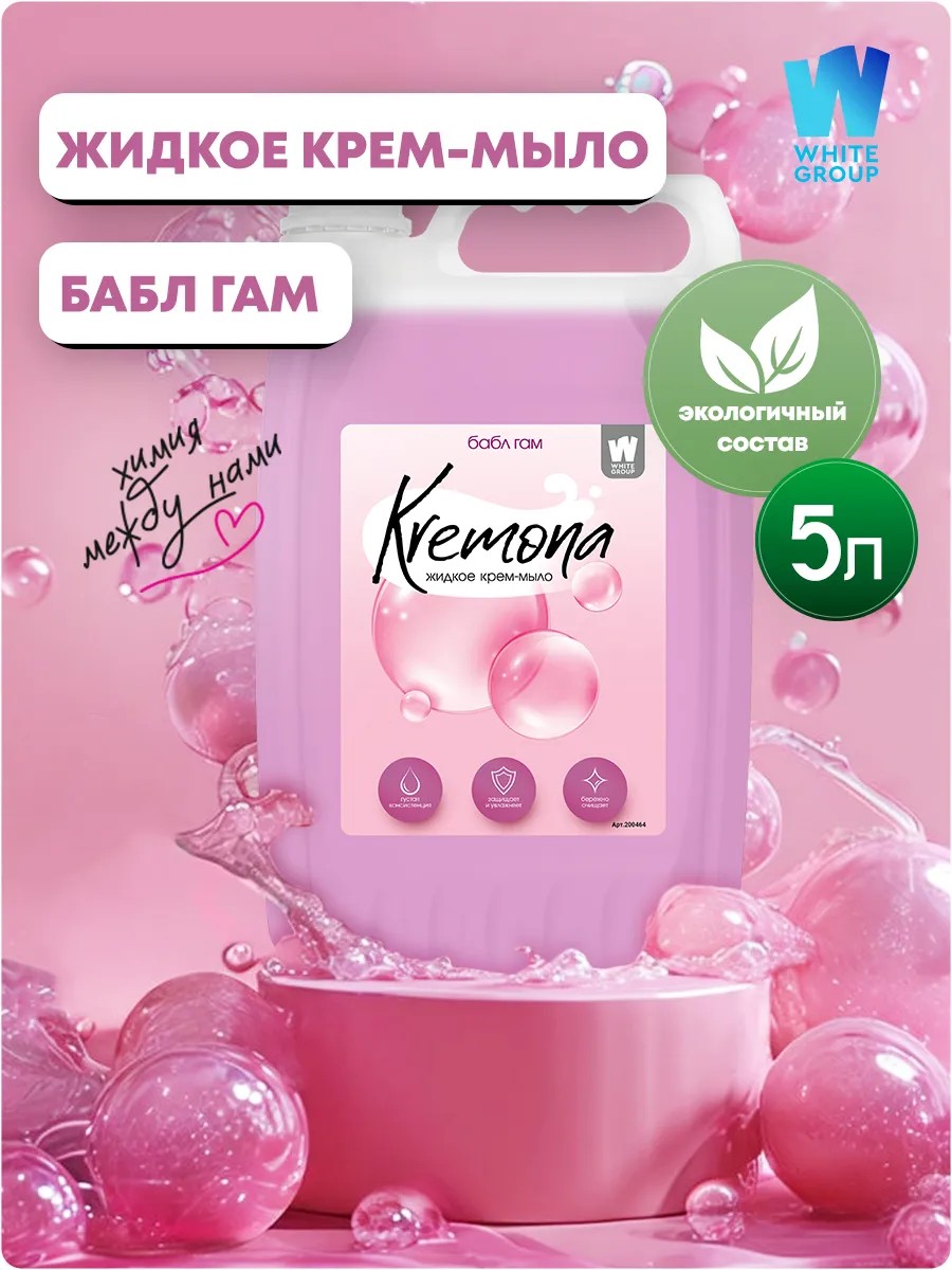 Жидкое мыло KREMONA с ароматом Бабл гам - отличный выбор для ежедневного ухода за руками, которое очищает, питает и увлажняет кожу. Объем жидкого мыла для рук - 5л, что позволяет использовать его в течение длительного времени, особенно выгодно для большой семьи, и экономить на покупке новых флаконов. Жидкое мыло Кремона - это не просто мыло, его также использовать как гель пенка для душа, который обеспечивает нежный и эффективный уход за телом. Мы используем только высококачественные ингредиенты, чтобы наши продукты были деликатными к коже, но при этом эффективно очищали и увлажняли. Наше густое крем мыло для рук жидкое идеально подходит для взрослых и для детей, а также для использования в качестве мыла для интимной гигиены женщин, поскольку обладает гипоаллергенной формулой, может быть использовано даже как банное.