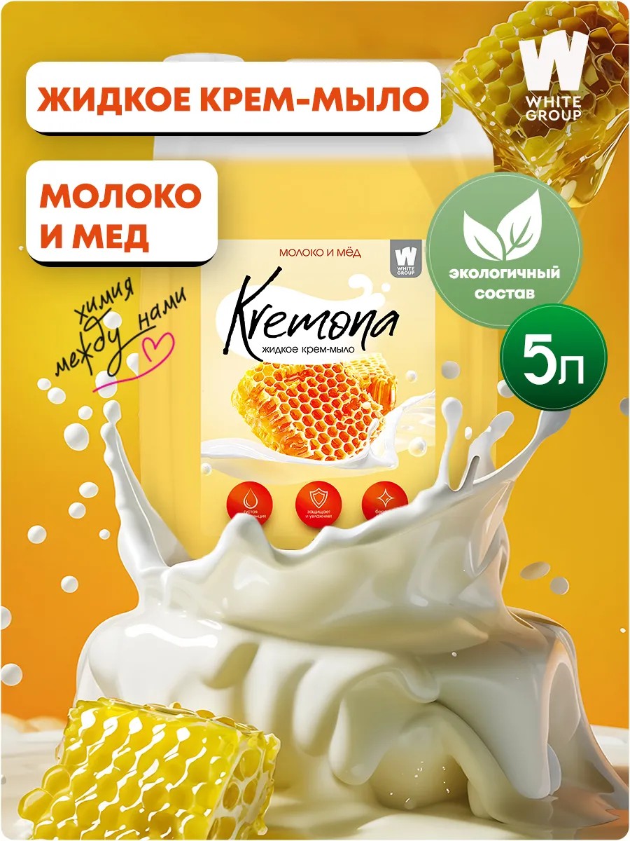 Жидкое мыло KREMONA с ароматом Молоко и мед - отличный выбор для ежедневного ухода за руками, которое очищает, питает и увлажняет кожу. Объем жидкого мыла для рук - 5л, что позволяет использовать его в течение длительного времени, особенно выгодно для большой семьи, и экономить на покупке новых флаконов. Жидкое мыло Кремона - это не просто мыло, его также использовать как гель пенка для душа, который обеспечивает нежный и эффективный уход за телом. Мы используем только высококачественные ингредиенты, чтобы наши продукты были деликатными к коже, но при этом эффективно очищали и увлажняли. Наше густое крем мыло для рук жидкое идеально подходит для взрослых и для детей, а также для использования в качестве мыла для интимной гигиены женщин, поскольку обладает гипоаллергенной формулой, может быть использовано даже как банное.