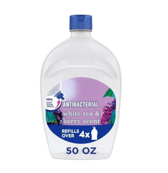 VALUE SIZE: Economical bulk refill option helps reduce plastic waste compared to buying multiple smaller bottles. EASY TO USE: Pour spout design allows for mess-free refilling of your existing soap dispensers. FRAGRANCE: Refreshing white tea and berry scent leaves hands smelling clean and fresh after each wash. VERSATILE COMPATIBILITY: Works with most standard bathroom and kitchen soap dispensers for convenient refilling. CAPACITY: Large 50 fluid ounce refill bottle provides long-lasting supply of hand soap for home or office use.