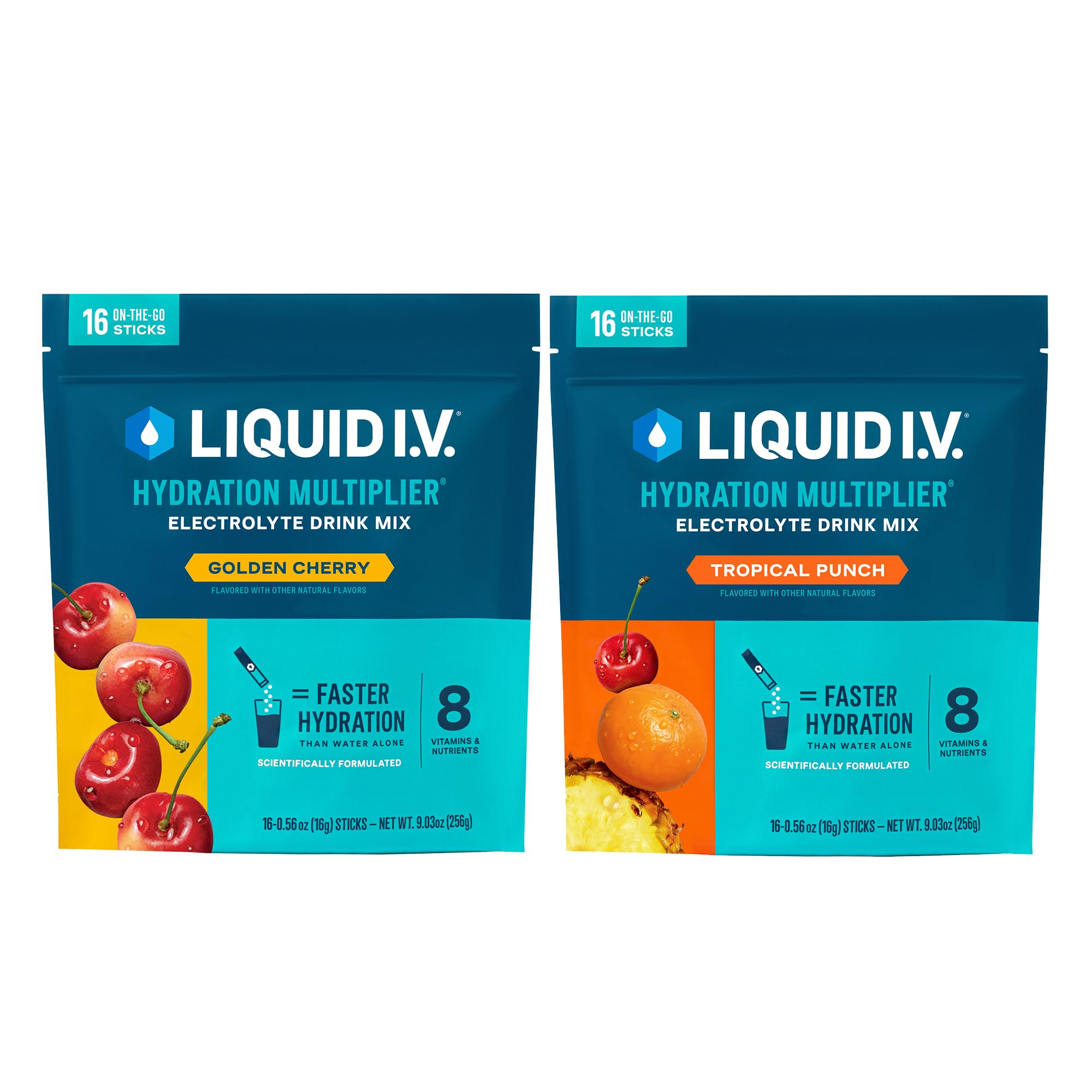 CONVENIENCE: Single-serving, travel-friendly packets are easy to enjoy on the go. Pour one easy-to-open packet into 16 oz of water, mix or shake, and hydrate. EXTRAORDINARY HYDRATION: Hydration Multiplier has 3x the electrolytes of the leading sports drink, and 8 vitamins and nutrients. It contains 100 of the daily value of 4 B vitamins: B3, B5, B6 and B12. Gluten-free, soy-free, and dairy-free. SCIENCE-BACKED FORMULA: Powered by LIV HYDRASCIENCE, Liquid I.V. is designed with an optimized ratio of electrolytes and clinically tested nutrients. GREAT TASTE: Golden Cherry is lush at first sip, with a hint of pineapple and citrus flavors, plus distinct notes of Rainier cherries. Tropical Punch has tangy notes of tangerine nectar, pineapple, and cherry flavors. HYDRATION MIX: A great-tasting, non-GMO electrolyte drink mix that delivers hydration faster than water alone.
