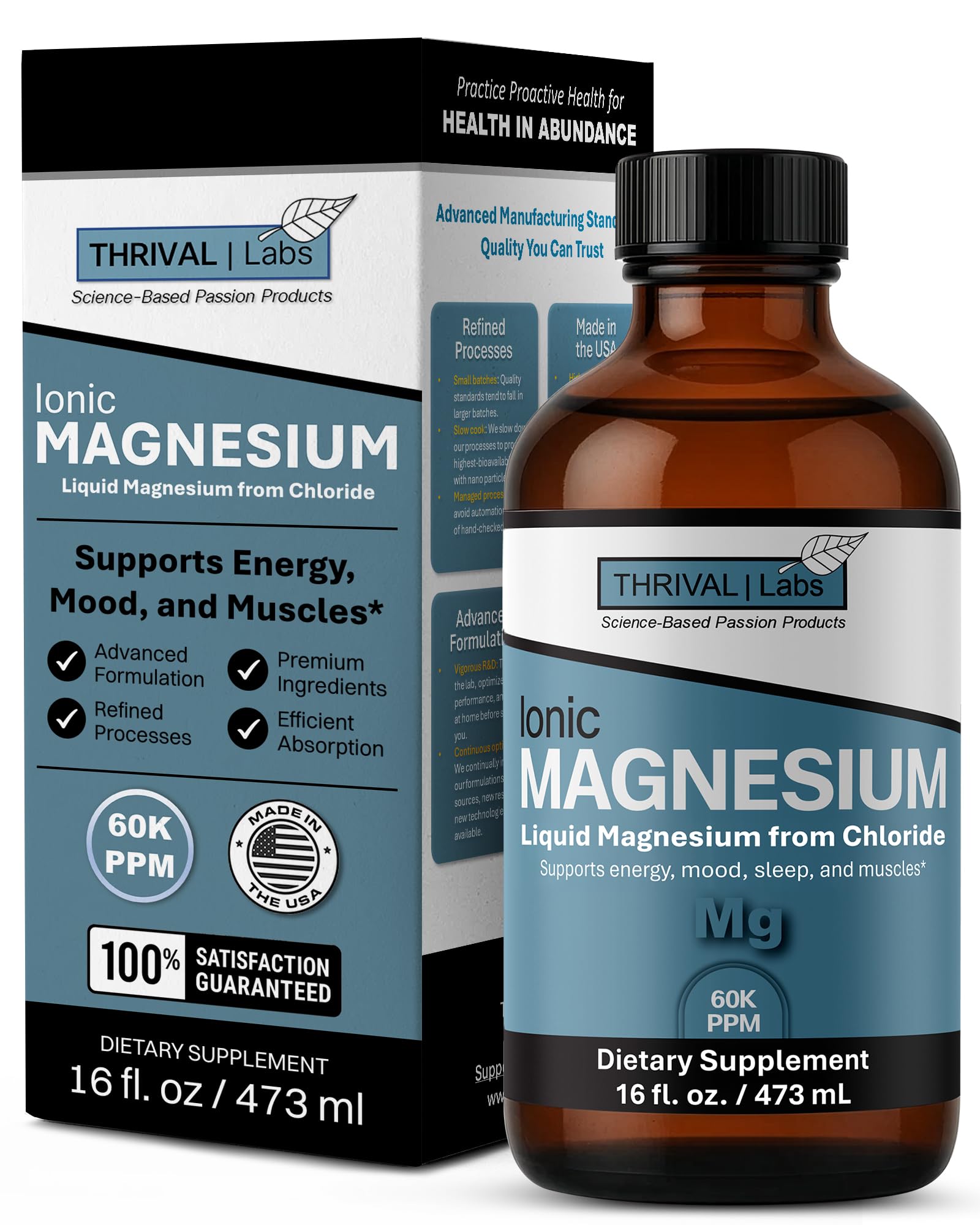 Elevate your daily wellness with Thrival Labs Liquid Magnesium, a high-absorption ionic magnesium supplement designed for easy, efficient daily use. This liquid magnesium provides ionic magnesium to support healthy magnesium levels, relaxation, steady energy, and overall wellness. Made in the USA from high-quality, US-sourced minerals, it uses magnesium chloride for dependable purity, consistency, and absorption. Ideal for those seeking magnesium for sleep support, calm mood, muscle comfort, and normal nerve function, this liquid format is perfect for anyone who prefers a simple alternative to capsules or tablets. The formula is clean, straightforward, and free from unnecessary additives. Key Features High-Absorption Ionic Form – Formulated for efficient uptake to help maintain healthy magnesium levels. 60K PPM Per Serving – Delivers a concentrated dose of ionic magnesium in an easy liquid format. USA Manufactured – Produced in the USA with minerals sourced exclusively from the United States. Easy to Use – Mix with water, juice, or smoothies for simple daily incorporation. Quality-Focused – Crafted under strict standards for purity, consistency, and reliable support. Benefits Supports healthy muscle and nerve function Helps promote steady energy and metabolic balance Aids normal electrolyte balance and digestive comfort Supports relaxation and nighttime magnesium for sleep Contributes to overall daily wellness when used consistently Suggested Use Mix the suggested serving with water, juice, or your preferred beverage and take daily, or as directed by your healthcare professional. Intended for use as part of a daily wellness routine for those seeking a convenient, high-absorption liquid magnesium supplement.EASY TO TAKE LIQUID FORMAT – This liquid magnesium can be mixed with water, juice, smoothies, or other functional beverages, offering a convenient way to support relaxation, energy, and everyday wellness. Its versatile liquid form is designed to support efficient absorption, so a small serving can help maintain healthy magnesium levels when used as directed on the label or by your healthcare professional. SUPPORTS KEY WELLNESS FUNCTIONS – Helps support steady energy, normal muscle and nerve function, relaxation, mood balance, and digestive comfort. A high-absorption daily magnesium option for younger and older individuals looking to maintain healthy magnesium levels and overall wellness. USA MANUFACTURED – Produced in the USA using high-quality, earth-sourced minerals, with magnesium chloride sourced exclusively from the United States for quality and traceability. Crafted for purity, consistency, and dependable wellness support. PREMIUM LIQUID MAGNESIUM FORM – Made with ionic magnesium sourced from magnesium chloride to support balanced mineral intake. Each serving provides 60K PPM of ionic magnesium in a clean, simple formula without unnecessary additives. LIQUID IONIC MAGNESIUM FOR HIGH ABSORPTION – Liquid ionic magnesium supports easy, efficient uptake and fits seamlessly into your routine, making it a gentle magnesium supplement ideal for both men and women with busy, active lifestyles seeking convenient daily support.