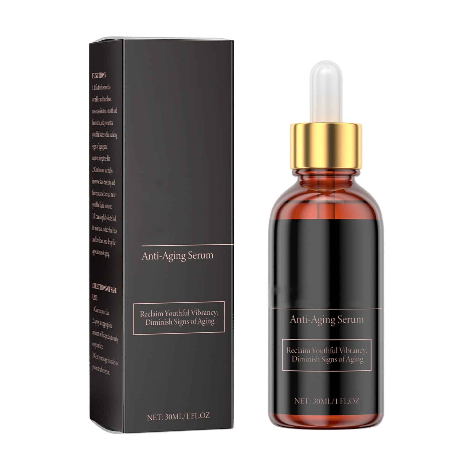 Unleash your skin's radiant potential Imagine waking up to firmer, smoother skin with a healthy-looking glow. Our anti-aging serum is scientifically formulated to help you achieve this goal. This intensive treatment is your daily companion to combat the signs of aging. Key Benefits of Our Advanced Formula: Rejuvenation: Our powerful formula targets common aging concerns. It reduces the appearance of expression lines like crow's feet and forehead wrinkles, helping you maintain a vibrant, youthful complexion. Boosts Skin's Natural Vitality: This serum boosts your skin's natural collagen production to help improve overall elasticity and firmness, leaving it feeling hydrated, resilient, and even-toned. The Ultimate Hydration Solution: Tired of dry, dull skin? This serum deeply hydrates, replenishing moisture for a smooth, plumped complexion that looks great with or without makeup. Product Details and Specifications: Capacity: 30 ml per bottle. Material: Made of high-quality amber glass bottle with a precision dropper. Dark glass helps protect active ingredients like vitamin C from light. Best Use: For best results, incorporate this into your daily skincare routine for men and women. After cleansing, apply 2-4 drops to your fingertips and massage gently into your face and neck in upward motions. Use morning and night. Our Promise: We are committed to providing high-quality skincare solutions. If you are not satisfied, please contact our customer service team.✓ Easy to Use, Great Value: Get the results of professional skincare at home. Apply 2-4 drops to your face and neck, morning and night. The 1 fl oz (30 ml) amber glass bottle comes with a dropper for precise, hygienic application and protects the formula from light damage. Gentle and Versatile: Suitable for daily use on all skin types, including sensitive, oily, dry, and combination. Our non-greasy formula absorbs quickly. Revitalizes Skin: Combats dullness and uneven skin tone, soothing the skin and promoting a more even complexion. Regular use helps reduce the appearance of dullness and signs of fatigue, leaving skin brighter and more vibrant. Deep Hydration and Firming: Going beyond surface hydration, it deeply nourishes the skin, helping to lock in essential moisture. This process improves elasticity and firmness, leaving it plump, hydrated, and radiant. Powerful Anti-Aging: Our advanced face serum is infused with peptides, vitamin C, and hyaluronic acid. This special formula penetrates deep into the skin's surface to reduce the appearance of fine lines and wrinkles, leaving skin smoother, firmer, and more youthful-looking.