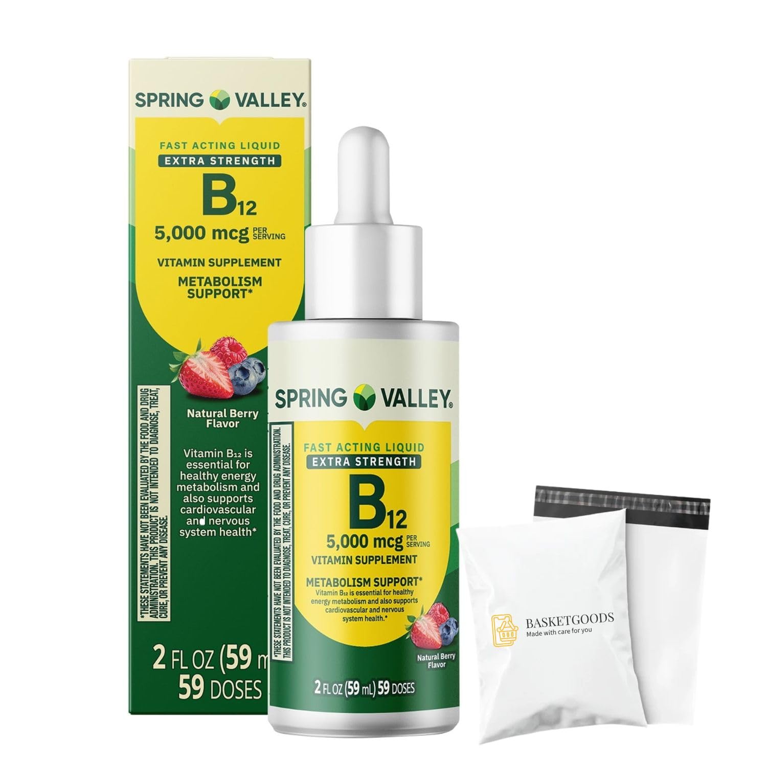 Liquid Vitamin B12 5000mcg Spring Valley Vitamin b12 Metabolism Supplement Berry Flavor 2 fl oz - Set by Basket Goods