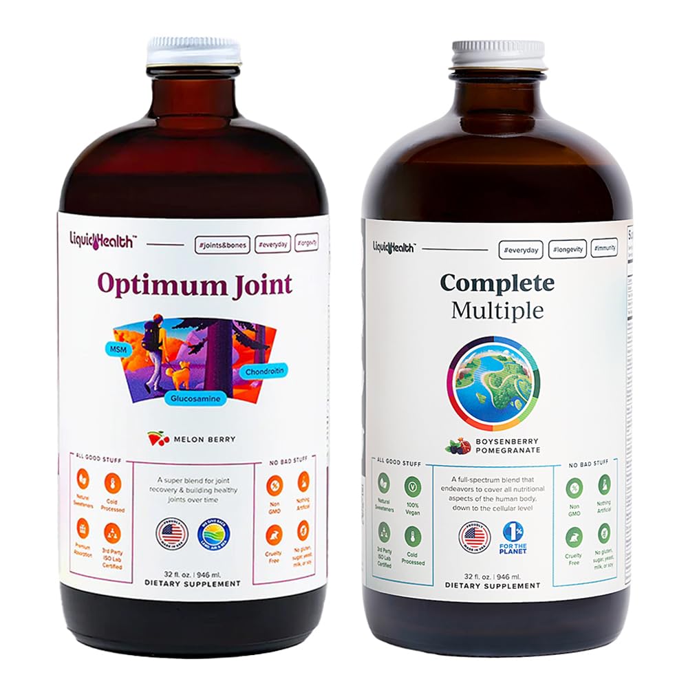 Achieve optimal health and wellness with Liquid Health's Optimum Joint Glucosamine Chondroitin supplement and Complete Multiple liquid multivitamin.ALLERGEN FREE NO ARTIFICIAL INGREDIENTS: Our liquid vitamin supplements are 100 vegan, cruelty free, non-GMO, gluten free, dairy free, soy free, and contain no artificial dyes, flavors, fillers, or added sugars. Great for individuals with food sensitivities, allergies, or dietary restrictions. Lab certified and made in the USA!. FAST ABSORBING LIQUID FORMULAS: Liquid vitamins have a higher absorption rate of 96 compared to traditional capsules, powder, or gummy vitamins with a rate of only 20 . Our easy-to-use, highly bioavailable liquid multivitamin juices are cold processed and pre-acidified so your body can easily absorb the essential vitamins and nutrients without being hard on your stomach!. LIQUID MULTIVITAMIN FOR MEN WOMEN: Liquid Health's Complete Multiple provides over 200 essential vitamins, minerals and nutrients for whole body health you can FEEL! With the Digestive Support blend, Amino Acids, Youth Energy complex, and Trace Minerals you've got everything you need to keep your gut healthy, immune system boosted, energy levels up, and brain sharp. THE HIGHEST QUALITY INGREDIENTS FOR JOINT SUPPORT: Liquid Health's Optimum Joint liquid multivitamin contains highly concentrated Glucosamine Hcl, Chondroitin Sulfate, MSM, Hyaluronic Acid, Pure Aloe Vera, Boron, Manganese, Calcium, and our specially formulated Joint Muscle Comfort Blend. This premium joint juice helps increase mobility, supports joint and cartilage health, relieves discomfort, and more. THE ULTIMATE USA MADE VITAMIN BUNDLE FOR ADULT MEN WOMEN: Achieve optimal health and wellness with Liquid Health's Optimum Joint Glucosamine Chondroitin supplement and Complete Multiple liquid multivitamin. These easy-to-use liquid vitamins taste great and provide all the vitamins and nutrients you need for joint support and whole body health!.
