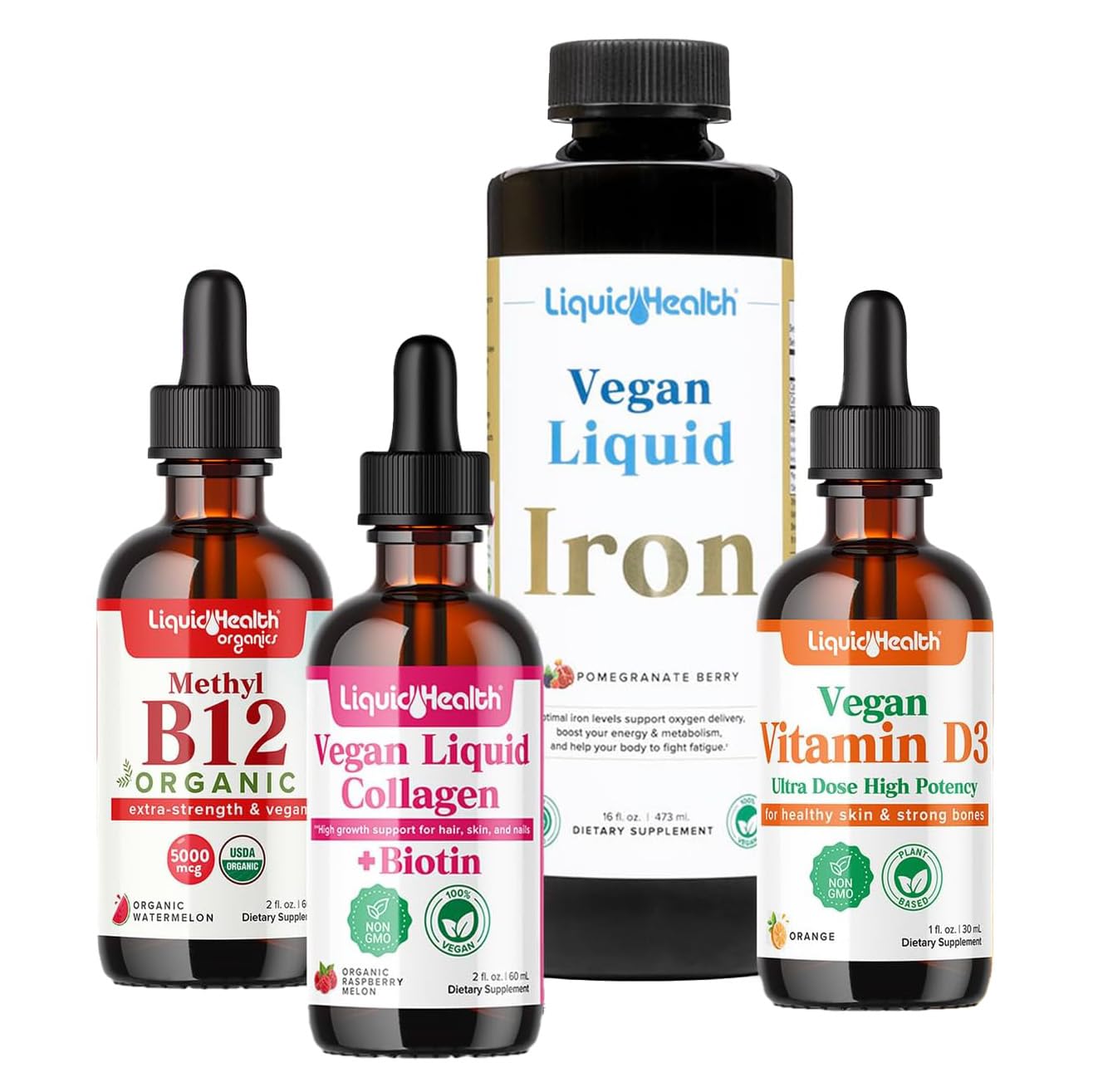 LIQUIDHEALTH Vegan Daily Essentials Vitamin Starter Kit with Organic Methyl B12 Drops, Vegan Liquid Collagen Biotin, Vegan Liquid Iron, Vegan Vitamin D3 Drops - 100 Plant-Based Vitamin SupplementsBOOST MOOD, IMMUNITY, BONE HEALTH, SKIN HEALTH MORE: Liquid Health's Vegan Vitamin D3 Drops with 5000 IU are made with pure, plant based D3 from naturally occurring plant species Lichen, Organic MCT oil, and Organic Orange oil. These high potency drops are essential for maintaining healthy bones and teeth, healthy skin, boosting immune system function, and improving overall wellness. VEGAN LIQUID IRON FOR ALL DAY ENERGY IMMUNE SUPPORT: Liquid Health's Vegan Liquid Iron with Ferrochel and Sunactive iron is designed to boost your energy levels, red blood cell function, support your immune system and metabolism, and plays a vital role in transforming carbohydrates and fats into energy. This liquid supplement is non-constipating, gentle on your stomach, easy to digest, and helps curb midday crash!. VEGAN COLLAGEN DROPS FOR HEALTHY HAIR, SKIN, NAILS: Liquid Health's Vegan Liquid Collagen drops are the first of their kind! Made with 100 plant-based Vegan Collagen AKA "Vollagen" and essential vitamins and minerals to support your body's natural collagen production. Nourish your body from the inside out for lustrous shiny hair, hydrated glowing skin, strong healthy nails, and a boosted metabolism. ORGANIC NATURAL ENERGY BOOST: Liquid Health's Certified Organic Vitamin B12 Drops contain 5000 mcg of Methylcobalamin, an easy-to-absorb form of Vitamin B12, and Organic Tart Cherry Juice. These essential, high-potency liquid B-supplement drops help to enhance your body's natural energy levels to fight fatigue and weakness, giving you a sustained energy boost throughout the day!. THE ULTIMATE USA MADE VEGAN VITAMIN ESSENTIALS KIT FOR PLANT-BASED DIETS: Whether you're new to veganism or a seasoned plant-based enthusiast, the Liquid Health Vegan Daily Essentials Vitamin Kit is here to support your journey to a healthier, happier you with Organic Methyl B12 drops, Vegan Liquid Collagen plus Biotin drops, Vegan Liquid Iron supplement, and Vegan Vitamin D3 drops! These liquid vitamins and drops taste great and are an easy addition to your daily vitamin regimen!.