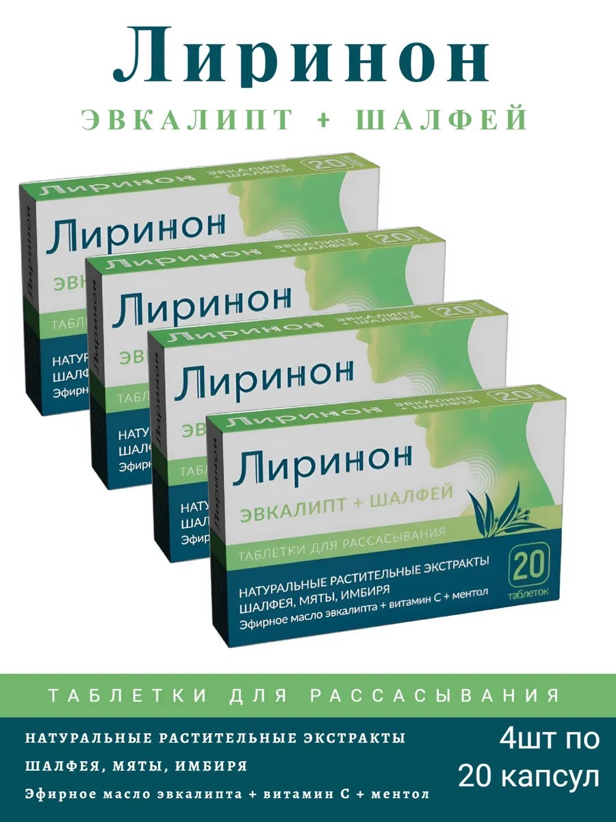 Таблетки для рассасывания «Лиринон» с эвкалиптом и шалфеем – это эффективное средство для облегчения дискомфорта в горле и полости рта. Благодаря натуральным компонентам препарат оказывает антисептическое, противовоспалительное и смягчающее действие, помогая при першении, кашле и раздражении.