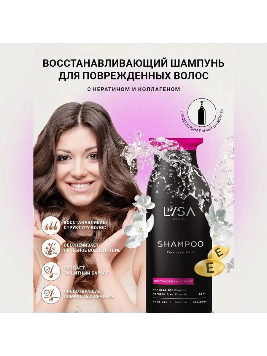 Шампунь Lisa из набора по уходу за волосами серии Recovery Care - секрет здоровых и сильных волос! Наш профессиональный шампунь содержит высокую концентрацию активных ингредиентов, таких как коллаген, кератин, витамин Е и масло амлы, которые глубоко проникают в структуру волоса, обеспечивая профессиональное лечебное действие. Коллаген возвращает естественную эластичность волос, а кератин укрепляет и создает защитный барьер от повреждений, предотвращая ломкость и сечение. Витамин E и масло амлы питают и увлажняют волосы, придавая им здоровый внешний вид и блеск. При регулярном использовании шампуня Lisa Recovery Care ваши волосы станут более сильными, гладкими и эластичными, с улучшенной текстурой, заметной на ощупь. Защитите кончики ваших волос от расщепления и верните им здоровье и жизненную силу с помощью шампуня Lisa. Попробуйте весь набор косметики по уходу за волосами серии Recovery Care и подарите своим волосам глубокое восстановление и увлажнение, которые им так нужны.