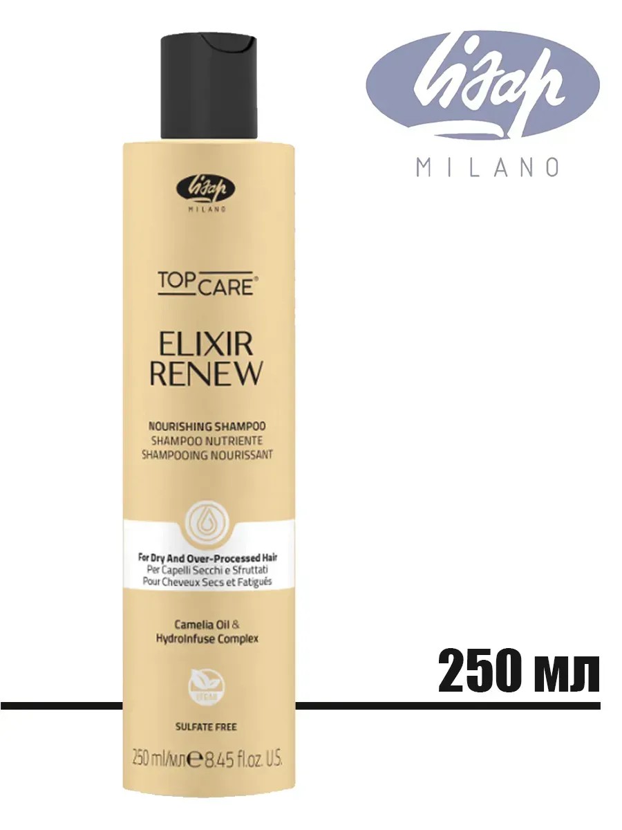 Увлажняющий и питательный шампунь Nourishing Shampoo обеспечивает деликатное очищение волос, одновременно придавая им необходимую влагу и питание, не утяжеляя. Использование шампуня позволяет волосам стать более мягкими, блестящими и послушными. Этот шампунь идеально подходит для всех типов волос, особенно для сухих, поврежденных и ослабленных, которым требуется восстановление и защита. Он обеспечивает комплексный уход, помогая сохранить их здоровье и красоту на длительное время. Преимущества: - бережное очищение. Шампунь мягко очищает волосы, не нарушая их природный баланс. Он не содержит парабенов, сульфатов и силиконов, что делает его безопасным для частого использования и для волос, склонных к аллергиям; - глубокое увлажнение. Формула шампуня обогащена активными ингредиентами, которые увлажняют волосы изнутри, делая их более мягкими и послушными. Он предотвращает сухость и ломкость, придавая волосам здоровый вид; - восстановление структуры. Способствует восстановлению поврежденных волос, улучшая их текстуру и блеск. После использования волосы выглядят более живыми и эластичными; - защита цвета. Шампунь также подходит для окрашенных волос, поскольку он помогает сохранить яркость цвета, защищая его от вымывания; - веганская формула; - без сульфатов. Активные ингредиенты: - масло камелии – обладает отличными питательными и восстанавливающими свойствами, укрепляет волосяные фолликулы, придает волосам сияние; - комплекс HydroInfuse Complex - обеспечивает интенсивное и длительное увлажнение, создает интенсивный блеск. Lisap Milano Elixir Renew — комплексный уход для здоровья, блеска и роскоши ваших волос после самых сложных процедур окрашивания и химической обработки. Сочетает инновационные формулы и силу натуральных компонентов, чтобы волосы стали мягкими, гладкими и сияющими, как после салонной процедуры.