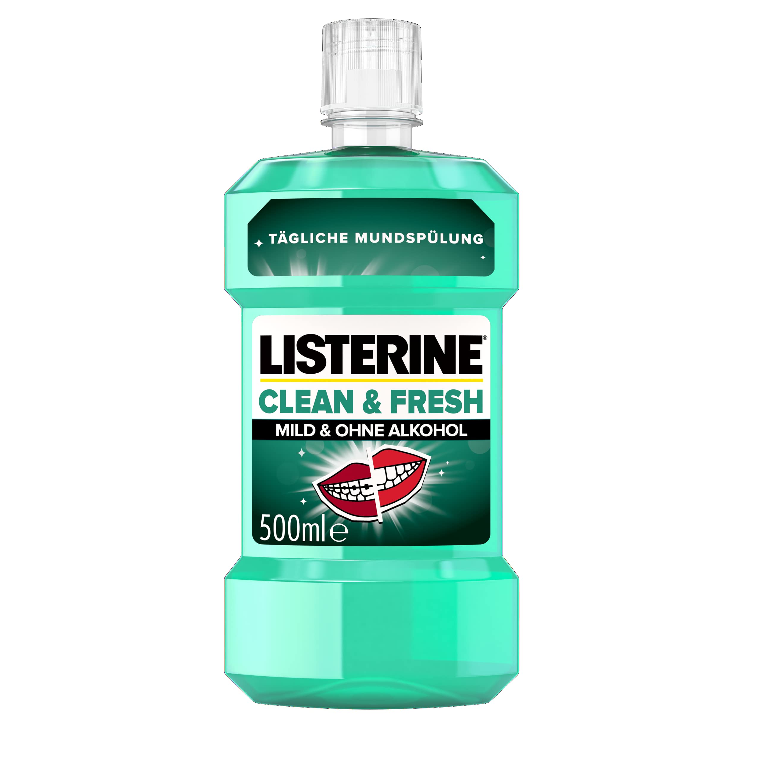 Applied twice a day, Listerine Clean and Fresh improve oral hygiene - with essential oils, fluoride and without alcohol.Antibacterial mouthwash strengthens the teeth by fluoride, prevents and reduces dental surface and prevents gum problems.Listerine's daily mouthwash reaches the places that the toothbrush misses - also between braces. Ingredients / ingredients [PR-017779]: Aqua, Sorbitol, Propylene Glycol, Sodium Lauryl Sulfate, Poloxamer 407, Benzoic Acid, Eucalyptol, Methyl Salicylate, Thymol, Sodium Saccharin, Sodium Fluoride, Sodium Benzoate, Menthol, Aroma, Benzyl Alcohol, Sucralose, CI 47005, CI 42053. Contains sodium fluoride (220 ppm f-). Address manufacturer/importer D-41470 Neuss, de More delivery - 1 x 500ml Listerine Clean and Fresh, daily mouthwash without alcohol, with and without braces.Suitable for braces-the antibacterial mouth rinsing removes up to 97 percent of the bacteria* (* collected from non-toothpagger).Prevents dental surface - the antibacterial mouthwash prevents and reduces dental surface, a main cause of gum infections and ensures a fresh and clean mouthfeel.Strengthens the teeth - the antibacterial mouthwash strengthens the teeth by fluoride.The antibacterial mouthwash Clean & Fresh from Listerine with mild mint taste and without alcohol removes up to 97% of the bacteria remaining after brushing your teeth*.(*collected data from non-toothpagen carriers). Zweimal am Tag angewendet, verbessert LISTERINE Clean und Fresh die Mundhygiene – mit ätherischen Ölen, Fluorid und ohne Alkohol. Die antibakterielle Mundspülung stärkt die Zähne durch Fluorid, verhindert und reduziert Zahnbelag und beugt Zahnfleischproblemen vor. Die tägliche Mundspülung von LISTERINE erreicht die Stellen, welche die Zahnbürste verpasst – auch zwischen der Zahnspange. INHALTSSTOFFE / ZUTATEN [PR-017779]: Aqua, Sorbitol, Propylene Glycol, Sodium Lauryl Sulfate, Poloxamer 407, Benzoic Acid, Eucalyptol, Methyl Salicylate, Thymol, Sodium Saccharin, Sodium Fluoride, Sodium Benzoate, Menthol, Aroma, Benzyl Alcohol, Sucralose, CI 47005, CI 42053. Enthält Natriumfluorid (220 ppm F-). ANSCHRIFT HERSTELLER/IMPORTEUR D-41470 Neuss, DE MehrLieferumfang – 1 x 500ml LISTERINE Clean und Fresh, tägliche Mundspülung ohne Alkohol, mit und ohne Zahnspange. Für Zahnspangenträger geeignet – Die antibakterielle Mundspülung entfernt bis zu 97 Prozent der nach dem Zähneputzen verbliebenen Bakterien* (*erhobene Daten von Nicht-Zahnspangenträgern). Verhindert Zahnbelag – Die antibakterielle Mundspülung verhindert und reduziert Zahnbelag, eine Hauptursache für Zahnfleischentzündungen und sorgt für ein frisches und sauberes Mundgefühl. Stärkt die Zähne – Die antibakterielle Mundspülung stärkt die Zähne durch Fluorid. Die antibakterielle Mundspülung Clean & Fresh von LISTERINE mit mildem Minzgeschmack und ohne Alkohol entfernt bis zu 97% der nach dem Zähneputzen verbliebenen Bakterien*. (*erhobene Daten von Nicht-Zahnspangenträgern).LISTERINE Clean & Fresh (500 ml), antibakterielle Mundspülung ohne Alkohol, Mundwasser mit ätherischen Ölen, mit und ohne Zahnspange