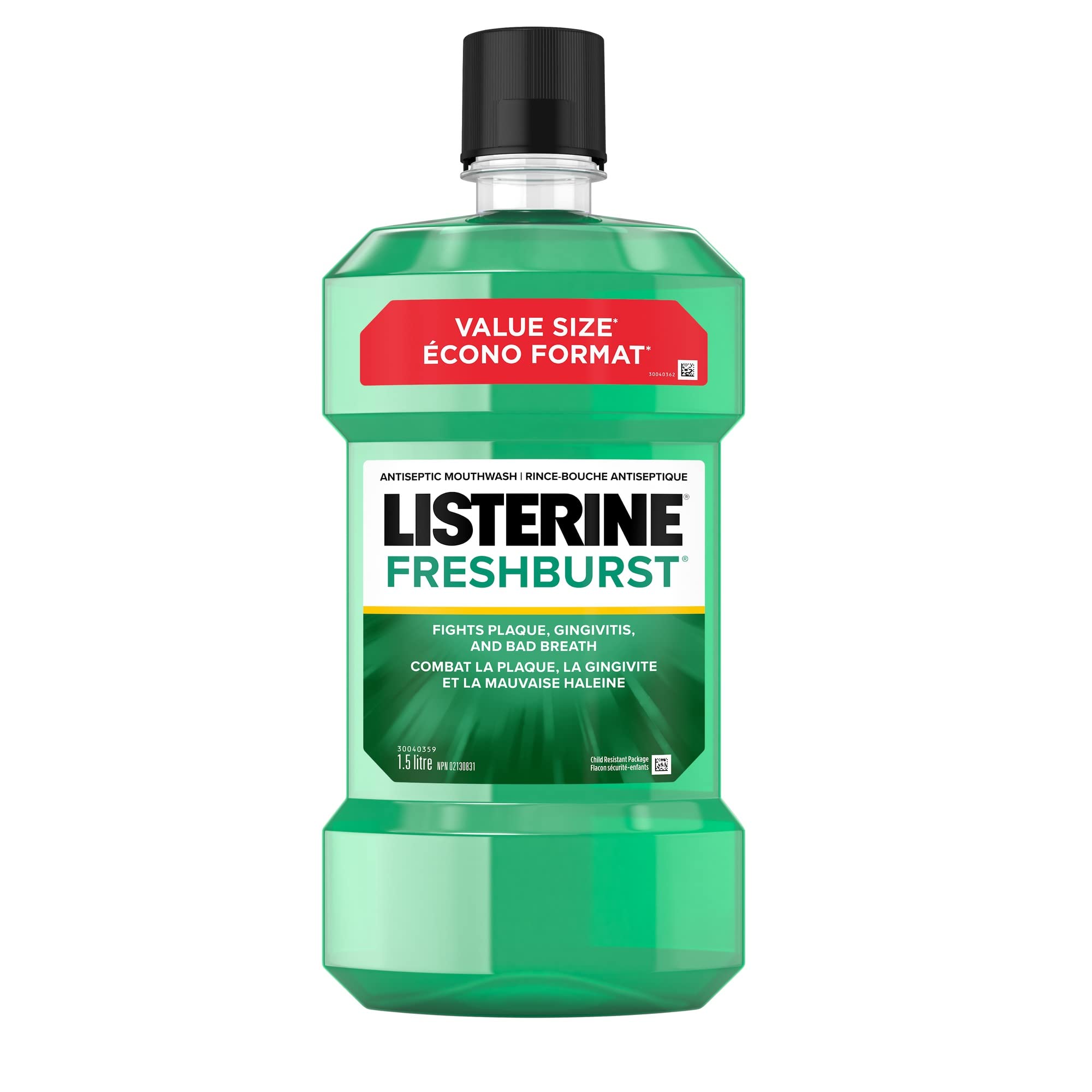 Listerine Fresh Burst Antiseptic Mouthwash protects your mouth from germs to fight against plaque, gingivitis, and bad breath. Listerine antiseptic mouthwash contains essential oils Menthol (mint), Thymol (thyme), and Eucalyptol (eucalyptus) to kill up to 99.9 of germs. The refreshing fresh burst flavour leaves your whole mouth feeling clean. Listerine Fresh Burst Antiseptic Mouthwash is recognized by the Canadian Dental Association (CDA) to help reduce and prevent the progression of gingivitis. To use, rinse full strength with 20 milliliters for 30 seconds twice a day. Gargle the mouthwash to relieve sore throat due to colds. Do not swallow the mouthwash. This product is intended for adults and children 12 years and older. Reduce plaque and gingivitis with Listerine, the 1 dentist-recommended brand among over-the-counter mouthwashes. Listerine Fresh Burst Antiseptic Mouthwash kills germs for a cleaner mouth. Oral health benefits validated by Canadian Dental Association (CDA). Adding Listerine Fresh Burst Antiseptic Mouthwash to a regular oral hygiene routine reduces and prevents gingivitis more than brushing and flossing alone. Protect your mouth from germs with Listerine Fresh Burst Antiseptic Mouthwash. Listerine Fresh Burst Antiseptic Mouthwash comes in 250-millilitre, 500-millilitre, and 1.5-litre bottle of antiseptics mouthwash.This refreshing mouthwash helps reduce and prevent the progression of gingivitis. Adding Listerine to a regular oral hygiene routine reduces and prevents gingivitis more than brushing and flossing alone. To use, rinse full strength with 20 milliliters for 30 seconds twice a day. Gargle to relieve sore throat due to colds. Do not swallow. For adults and children 12 years and older. Contains essential oils Menthol (mint), Thymol (thyme), and Eucalyptol (eucalyptus) to kill up to 99.9 of germs to prevent gingivitis, reduce plaque, and freshen breath. The refreshing flavour leaves your whole mouth feeling clean. Reduce plaque and gingivitis with Listerine, the 1 dentist-recommended brand among over-the-counter mouthwashes. Listerine Fresh Burst Antiseptic Mouthwash kills germs for a cleaner mouth. Protect your mouth from germs with Listerine Fresh Burst Antiseptic Mouthwash. The antiseptic mouthwash fights plaque, gingivitis, and bad breath. This product comes in a 1.5-litre bottle of antiseptics mouthwash in Fresh Burst flavour.