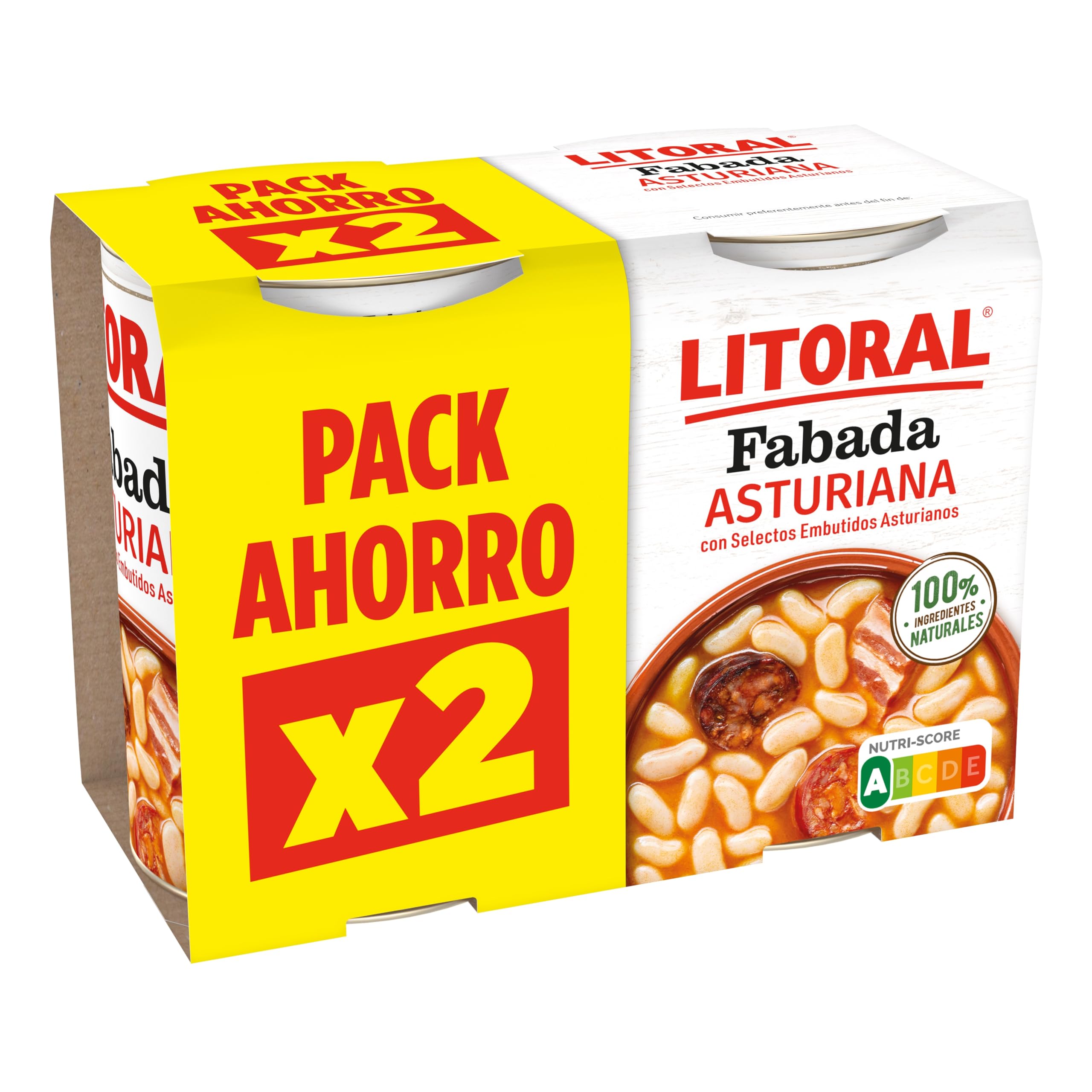 Enjoy authentic LITORAL Asturian fabada, made with select sausages produced in Asturias. A typical dish of Spanish gastronomy prepared with 100 natural ingredients, gluten-free and additive-free. A delicious and flavorful homemade recipe, easy to prepare and with LITORAL quality. INGREDIENTS Cooked beans 46.7 (water, beans 19.4 ), water, extra chorizo 5.9 (cheek, lean pork belly, paprika, salt, garlic), dried sausage 5.5 (bacon, cheek, bacon, blood, lean pork, onion, paprika, salt, oregano), smoked bacon 5.5 (0 lard, salt, smoke), Iberian lard, salt. Gluten-free