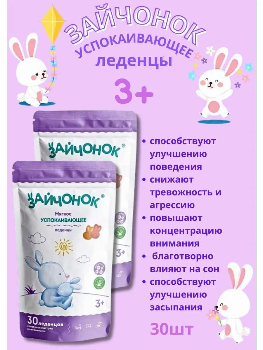 Зайчонок леденцы для детей с 3-х лет товарного знака здравландия леденцы - это биологически активная добавка (БАД) к пище. Компоненты комплекса «Леденцы «Зайчонок» для детей с 3-х лет товарного знака «Здравландия» оказывают мягкое успокаивающее действие.