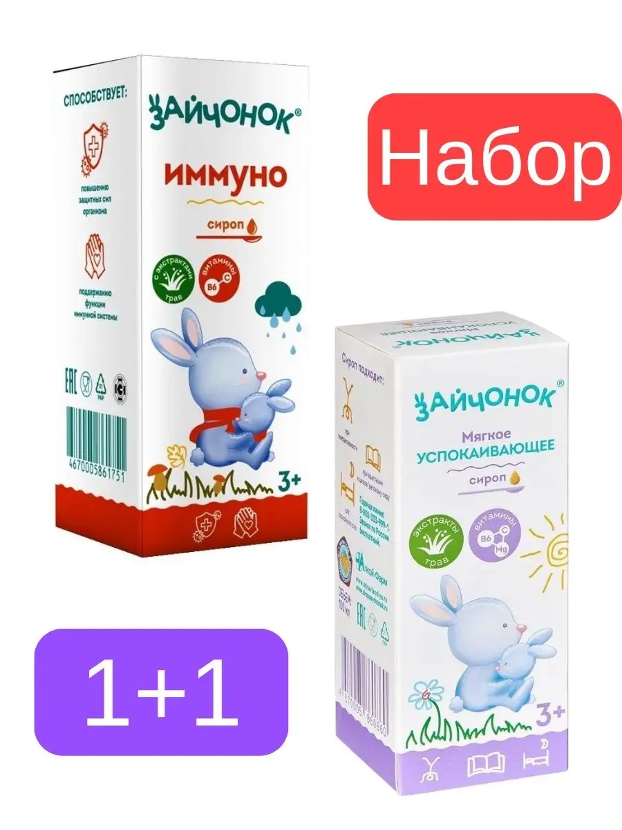 | Комплектация | Сироп Зайчонок Иммуно 100 мл - 1 штука; Сироп Зайчонок Успокаивающий 100 мл - 1 штука |