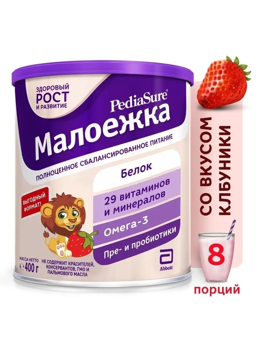 PediaSure Малоежка - это вкусный питательный напиток с недостаточным питанием, который дополнит несбалансированную еду питательными веществами, чтобы ребёнок получал всё самое необходимое для здорового роста, развития и укрепления иммунитета*. Предназначен для питания детей от 1 года до 10 лет, подходит для ежедневного употребления. В одной банке 400 г содержится 8 порций.В одной порции 225 мл содержится 29 важнейших витаминов и минералов (включая витамины D, A и C), 6.7 г белка, кальций, йод, железо, Омега-3, 6 жирные кислоты, про- и пребиотики. Сбалансированный состав помогает ребенку не только расти и развиваться, но и поддерживать иммунную защиту*, благодаря содержанию макро- и микронутриентов. Предупреждение:Не использовать при галактоземии. Подходит для детей с повышенной чувствительностью к лактозе. Не для парентерального (внутривенного) введения. Не использовать у детей до 1 года. *Благодаря содержанию макро- и микронутриентов для детей с недостаточностью питания.