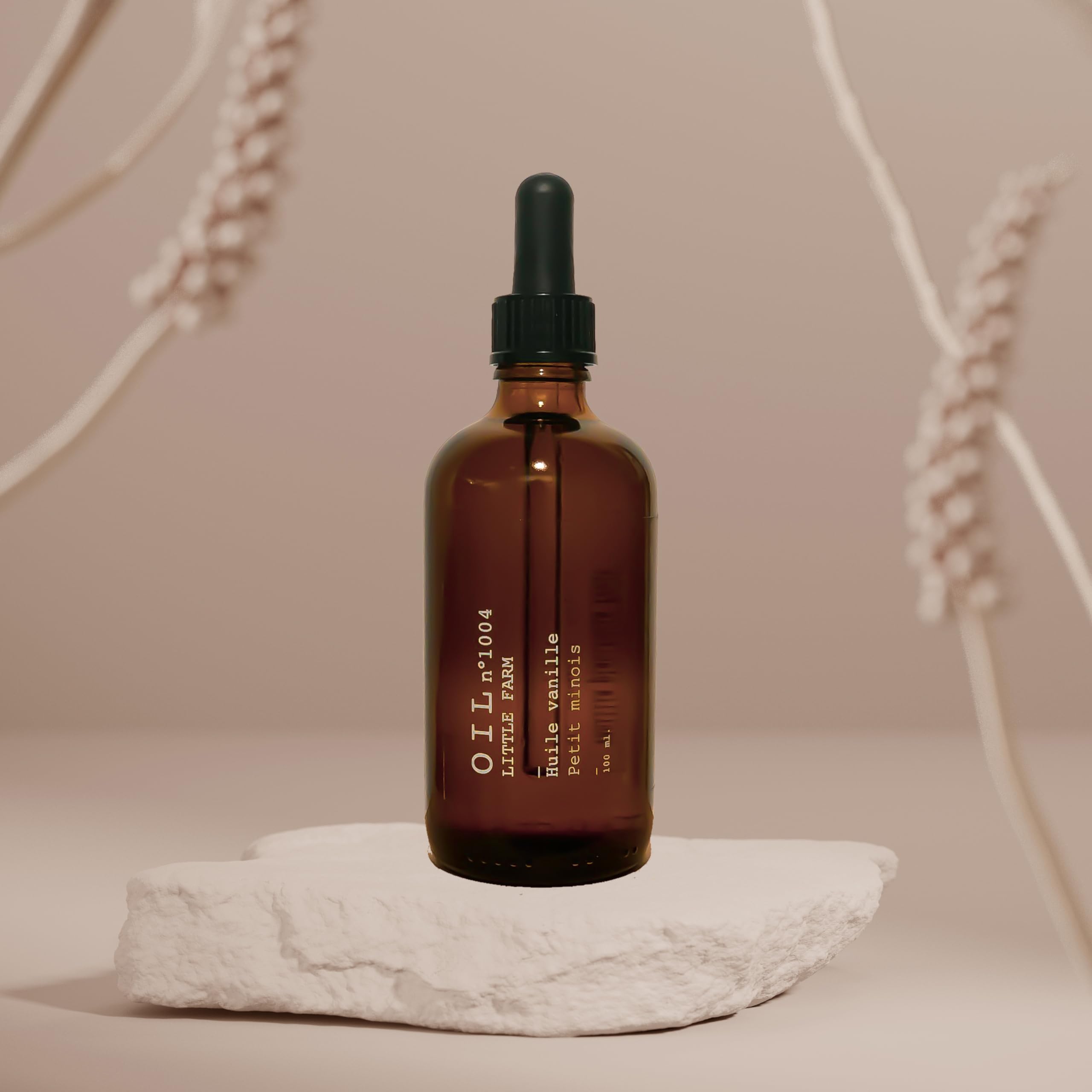 Petit Minois Vanilla Oil: A synergy of hazelnut, jojoba, sweet almond, and vanilla oils. A concentrated dose of softness for the whole family's skin. 100 ml.
