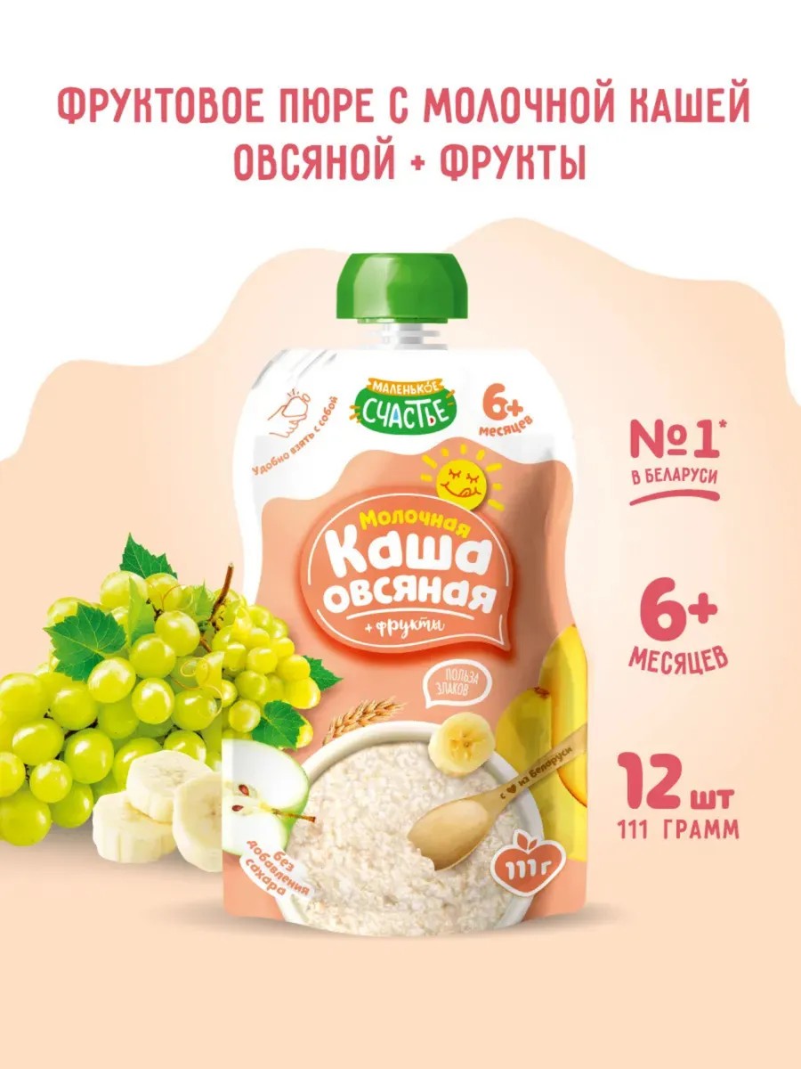 Молочная каша с фруктами Маленькое счастье - готовый к употреблению продукт, который удобно использовать в поездке и на прогулке. Увеличенная граммовка 111 гр - для полного насыщения малыша и школьника.