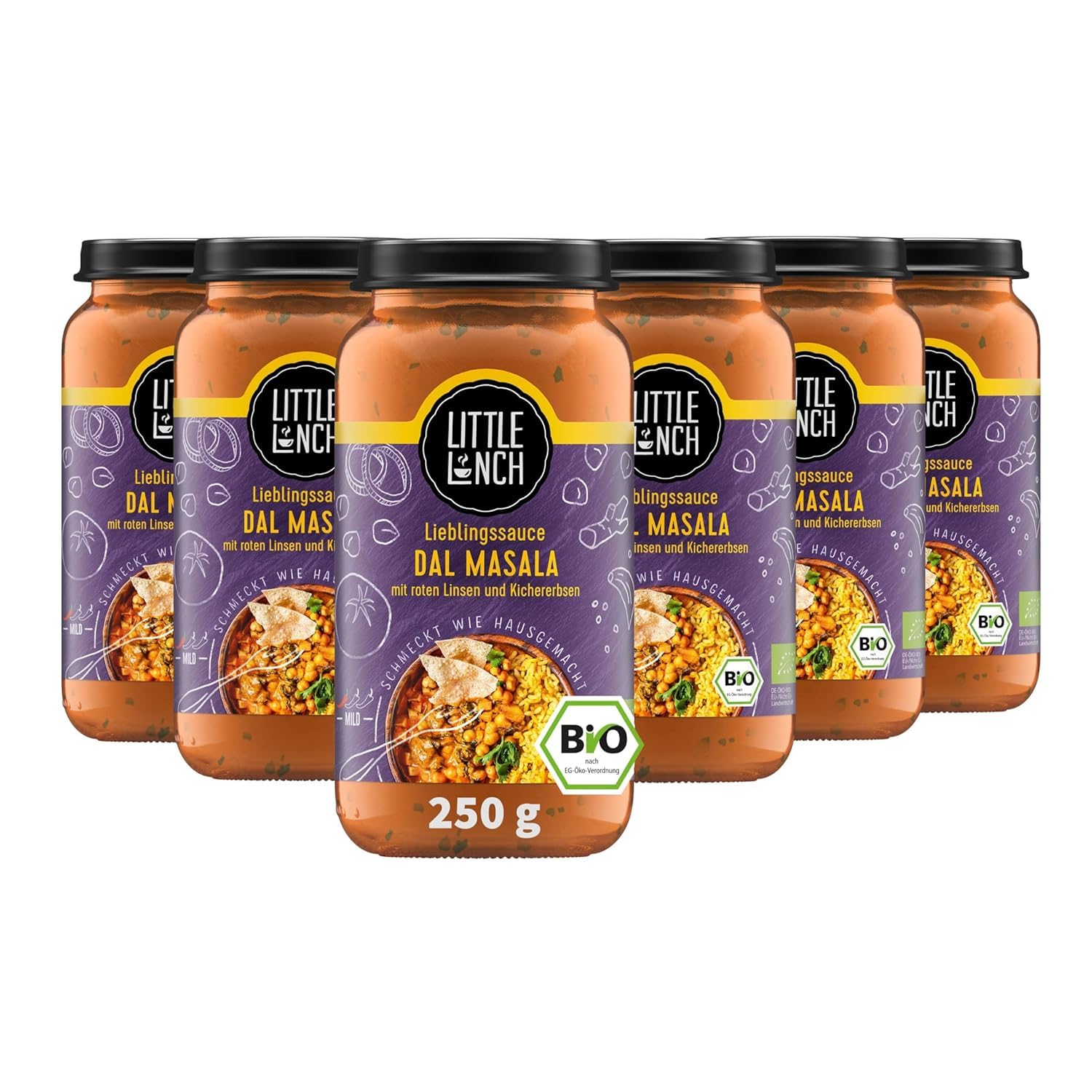 Hardly any kitchen is currently as popular as the Indian - we don't get enough of it either.Our Dal Masala combines the classic spice mix of Indian cuisine with chickpea and red lentils.Natural taste, like homemade - without artificial additives.Fits perfectly with: rice quinoa and flatbread. Ingredients / ingredients 20% tomato puree*, 16.5% red lentils*, carrots*, water, 9% onions*, 8% chickpeas*, zucchini*, sunflower oil*, grape juice*(from grape juice concentrate), strength*, sea salt, spices (garlic*, 0.2% ginger*, cumin, turmeric*, chili*), lemon juice*(from lemon juice concentrate), coriander leaves*.May contain traces of gluten.*Ingredients from controlled biological production Address manufacturer/importer Littlelunch GmbH, Am Alten Schlachthof 1, 86153 Augsburg More practical portion size: a glass lunch lunch darling sauce dal masala corresponds to a portion and ensures less food waste;The sauce is already ready for consumption and is ideally complemented with any side dish.Vegan and lactose -free: We have something for every taste and a large selection of vegan and lactose -free products;Our Dal Masala is a vegan, Indian classic and makes the heart of chickpea fans beat faster.Simple and quick: you don't have time or desire to cook.Then our favorite sauces are the solution;The DAL Masala sauce goes well with rice, pita bread or other side dishes and can be heated in a pot or the microwave in no time.100 percent natural and without added sugar: At our favorite sauce Dal Masala, we completely avoid artificial additives, preservatives and also do without any added sugar;No flavor enhancers, no glutamate.Fully bio- Really delicious: For our favorite sauce Dal Masala we only use the best ingredients from 100 percent organic quality and completely do without artificial frills;With our organic sauce, every meal tastes homemade. Kaum eine Küche ist derzeit so beliebt wie die indische – auch wir bekommen nicht genug davon. Unser Dal Masala vereint die klassische Gewürzmischung der indischen Küche mit Kichererbse und roten Linsen. Natürlicher Geschmack, wie hausgemacht – ohne künstliche Zusätze. Passt perfekt zu: Reis Quinoa und Fladenbrot. INHALTSSTOFFE / ZUTATEN 20% Tomatenpüree*, 16,5% rote Linsen* gekocht, Karotten*, Wasser, 9% Zwiebeln*, 8% Kichererbsen*, Zucchini*, Sonnenblumenöl*, Traubensaft* (aus Traubensaftkonzentrat), Stärke*, Meersalz, Gewürze (Knoblauch*, 0,2% Ingwer*, Kreuzkümmel, Kurkuma*, Chili*), Zitronensaft* (aus Zitronensaftkonzentrat), Korianderblätter*. Kann Spuren von GLUTEN enthalten. *Zutaten aus kontrolliert biologischer Erzeugung ANSCHRIFT HERSTELLER/IMPORTEUR littlelunch GmbH, Am alten Schlachthof 1, 86153 Augsburg MehrPRAKTISCHE PORTIONSGRÖßE: Ein Glas Little Lunch Lieblingssauce Dal Masala entspricht einer Portion und sorgt nachhaltig für weniger Lebensmittelverschwendung; Die Sauce ist bereits verzehrfertig und ergänzt sich ideal mit einer beliebigen Beilage. VEGAN und LAKTOSEFREI: Wir haben für jeden Geschmack etwas dabei und eine große Auswahl an veganen und laktosefreien Produkten; Unser Dal Masala ist ein veganer, indischer Klassiker und lässt das Herz von Kichererbsen-Fans höher schlagen. EINFACH und SCHNELL: Du hast keine Zeit oder Lust zu kochen. Dann sind unsere Lieblingssaucen DIE Lösung; Die Dal Masala Sauce passt ideal zu Reis, Pitabrot oder anderen Beilagen und kann im Handumdrehen im Topf oder der Mikrowelle erwärmt werden. 100 Prozent NATÜRLICH und OHNE ZUGESETZTEN ZUCKER: Wir verzichten bei unserer Lieblingssauce Dal Masala komplett auf künstliche Zusätze, Konservierungsstoffe und kommen auch ganz ohne zugesetzten Zucker aus; Keine Geschmacksverstärker, kein Glutamat. VOLL BIO- ECHT LECKER: Für unsere Lieblingssauce Dal Masala verwenden wir nur beste Zutaten aus 100 Prozent Bio-Qualität und verzichten komplett auf künstlichen Schnickschnack; Mit unserer Bio Sauce schmeckt jede Mahlzeit wie hausgemacht.Little Lunch Bio Indisches Gemüsecurry mit Linsen | Dal Masala | Sauce für Reis | 100 Prozent Bio-Qualität | Vegan | Ohne zugesetzten Zucker | Laktosefrei | Keine künstlichen Zusätze | 6 x 250g