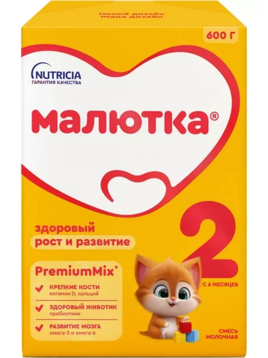 МАЛЮТКА-2 СМЕСЬ МОЛОЧНАЯ 600,0МАЛЮТКА 2 молочная смесь с 6 месяцев содержит:- Омега 3 и Омега 6 жирные кислоты для развития нервной системы- Пребиотики ГОС/ФОС - натуральные пищевые волокна, по составу приближенные к пребиотикам грудного молока для улучшения пищеварения.- Витамины и минералы, необходимые для гармоничного развития в соответствии с возрастом малыша. Соответствует возросшим потребностям ребенка второго полугодия жизни. Смесь МАЛЮТКА 2 отличается по составу от МАЛЮТКИ 1.Эта смесь более калорийная, в ней содержится больше питательных веществ, витамины и минералы, оптимизированы с учетом возраста малыша.Омега 3 и Омега 6 – это жирные кислоты, которые необходимы для здорового развития нервной системы малыша. У новорожденных детей омега-3 и омега-6 образуются в ограниченном количестве, поэтому необходимо их дополнительное поступление в составе грудного молока или смеси. Адекватное и сбалансированное количество жирных кислот в питании малыша необходимо для правильного роста и развития всех органов и тканей, именно поэтому в Новой формуле МАЛЮТКА содержатся омега-3 и омега-6 жирные кислоты.Пребиотики ГОС/ФОС (галактоолигосахариды/фруктоолигосахариды) - натуральные пищевые волокна, по составу приближенные к пребиотикам грудного молока. Пребиотики необходимы для улучшения пищеварения малыша, а их оптимальное сочетание помогает правильному развитию собственной здоровой микрофлоры кишечника. Данный комплекс пребиотиков обеспечивает регулярный мягкий стул у малышей и оптимальный уровень бифидобактерий.Умное железо в составе смесей МАЛЮТКА - это железо в оптимальном сочетании с цинком и витамином С для лучшего усвоения железа, что важно для профилактики распространенного у детей раннего возраста железодефицита и правильного роста и развития.Пальмовое масло – важный компонент, входящий в состав смеси масел, которые легко и быстро усваиваются детским организмом. Пальмовое масло необходимо для приближения жирового компонента смеси к жировому составу грудного молока