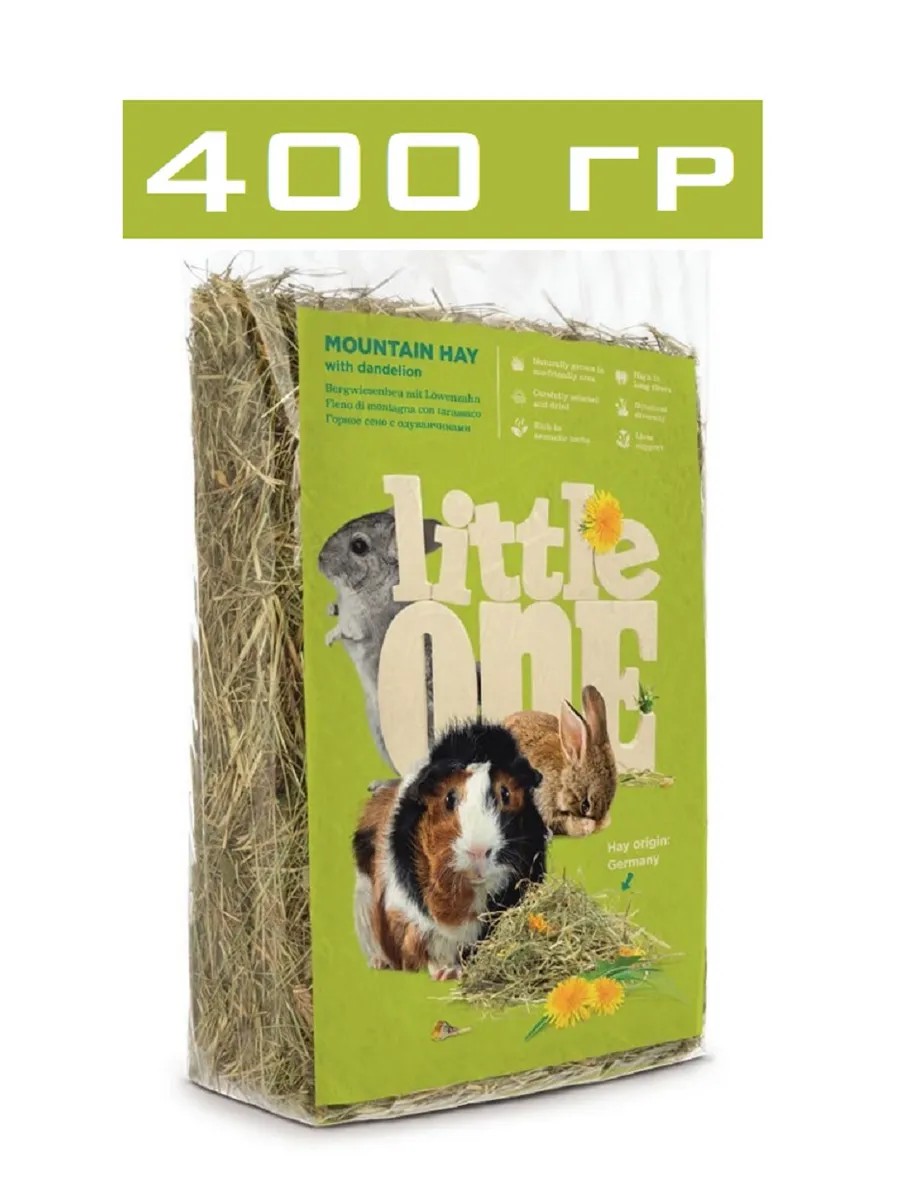 Горное сено с одуванчиком Little One — ароматное, очищенное и высушенное; собрано в экологически чистых горных районах и обогащено цветами одуванчика. Сено является основной составляющей рациона всех травоядных животных (кроликов, морских свинок, шиншилл, дегу), поэтому важно обеспечить его постоянное наличие в клетке.
