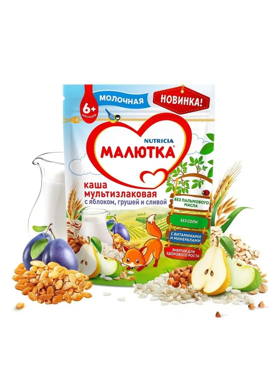 Multi-grain milk porridge for babies from 6 months, apple-pear-plum, 220g. Malutka porridges are the real deal! The recipes are based on selected grains from the Russian fields of Altai, Stavropol, and Krasnodar, grown and selected according to high quality standards. When creating these porridges, Nutricia specialists were inspired by the nature of Russia's regions. Each serving contains proteins, vitamins, and minerals necessary for development, as well as carbohydrates that give your baby the energy to grow. No palm oil. No salt. Unless otherwise recommended by a specialist, it is recommended to introduce your child to a new product gradually, starting with one spoon, increasing to the approximate age-appropriate norm over 5-7 days: from 6 months - up to 150 ml, from 8 months - 180 ml, from 9 months - 200 ml.