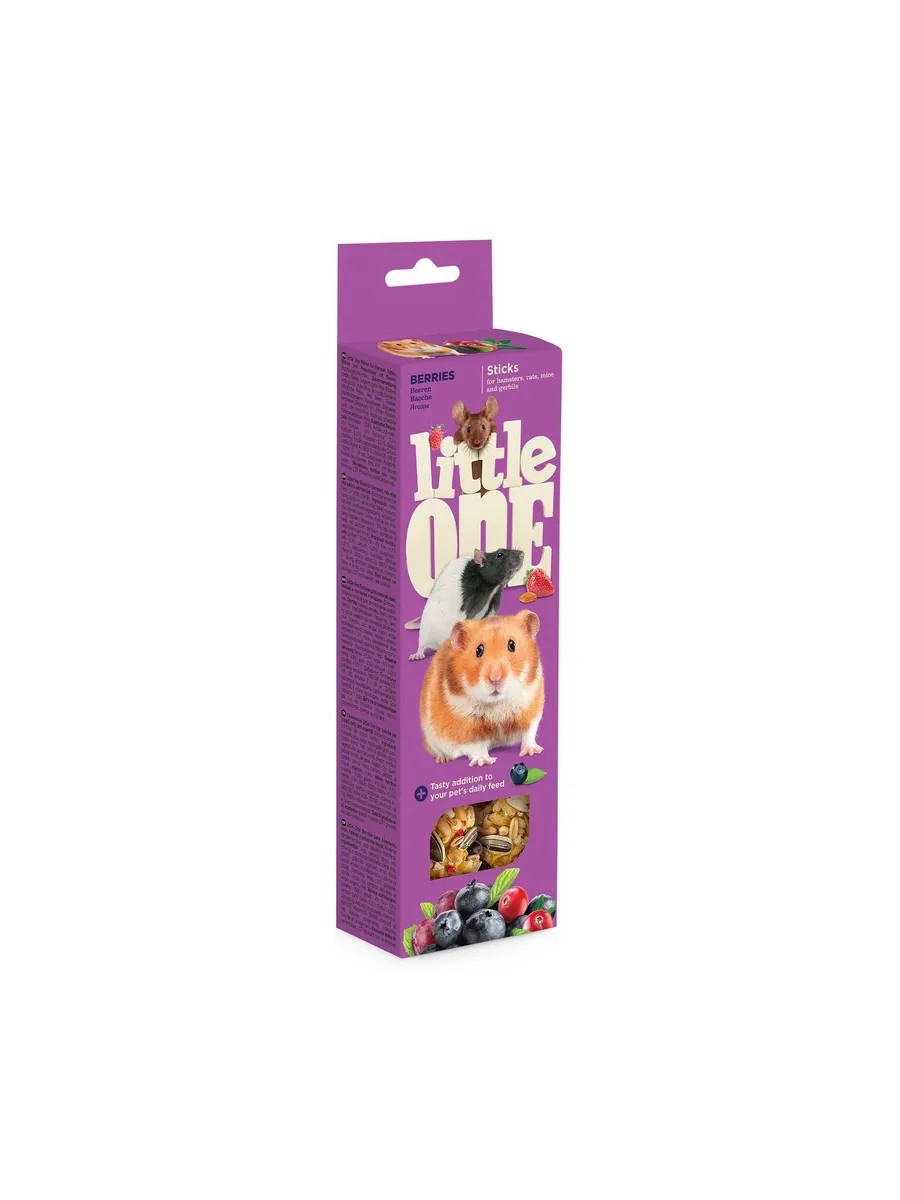 Little One berry sticks are a true paradise for rodents. Their delicious flavor, enhanced vitamin complex, and firm, sturdy texture will captivate your pet. The berries contain vitamins, nutrients, and minerals that will help boost your pet's strength and energy, replenishing vitamin and amino acid deficiencies. The sticks don't crumble or break, making them excellent for cleaning rodents' teeth. Vitamins D3, B, and E strengthen cardiovascular function and improve brain function. Fatty acids will keep your pet's skin and coat healthy. Ingredients: wheat, yellow millet, barley, sorghum, oatmeal, corn, sunflower seeds, vegetable granules, bakery products, berries (raisins, juniper berries, cranberries, blueberries, raspberries, strawberries), rice, canary seed, red panicum, peas, red millet, rolled barley, rolled corn, safflower, plant products, vitamin and mineral complex, inulin.