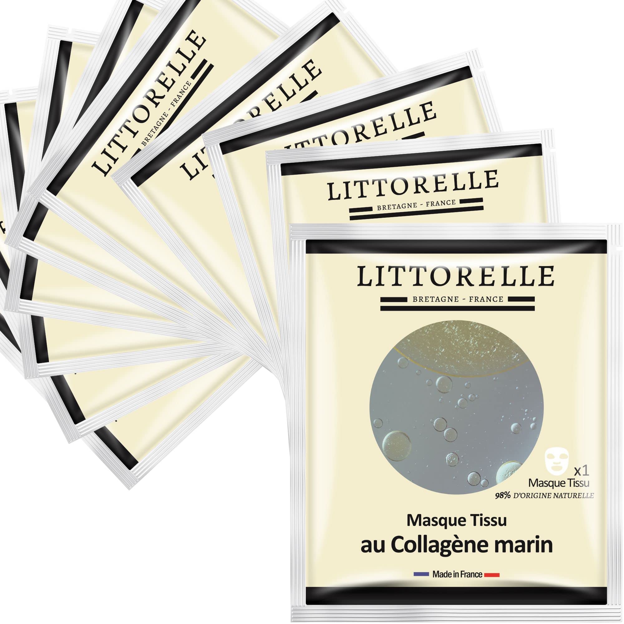 Hydrating Serum Mask with Marine Collagen and Vitamin E – Hydrating and Youthful Radiance - Pack of 5 Infused with a serum enriched with marine collagen, this mask provides intense hydration and a true moment of well-being. Skin is revitalized and regains a fresh, velvety complexion. Rich in Vitamin E, it protects your skin and fights the signs of aging. Skin becomes more supple and softer. Made in Brittany, France. Active Ingredients Marine Collagen: A major component of the skin, collagen is responsible for its elasticity and resilience. Marine collagen, with a structure identical to that of the skin, also possesses significant hydrating properties. Vitamin E: Delta-rich tocopherol is a natural antioxidant composed of vegetable oils, soybean oil, and rapeseed oil. With its powerful antioxidant properties, Vitamin E helps combat the first signs of aging and protects the skin by strengthening its hydrolipidic film. By increg the skin's water retention capacity, it improves its appearance and reduces the appearance of wrinkles. The skin becomes more supple and softer. Beauty Ritual Open the sachet and unfold the mask. Apply the ready-to-use mask to a perfectly cleansed face. Hook the mask over your ears using the top notches. Then, take the bottom part and reposition the notches over your ears. Leave on for 15 minutes, then remove the mask and gently massage in any excess serum. Precautions for use: In case of direct contact with the eyes, rinse with clean water. Ingredients : INGREDIENTS: Aqua (Water), Hydrolyzed Collagen, Phenoxyethanol, Lysolecithin, Sclerotium Gum, Caprylyl Glycol, Chlorphenesin, Pullulan, Xanthan Gum, Parfum (Fragrance), Tocopherol, Sodium Phytate, Silica, Limonene, Geraniol, Linalool, AlcoholLittorelle – Masque Visage N 6 Sérum Hydratant au Collagène et Vitamine E – Made in France – Anti-Age et Hydratant – Soin Anti-Rides – Masque Tissu Tous Types de Peaux- Lot de 10 unitésDESCRIPTION DU PRODUIT Masque Sérum Hydratant au Collagène Marin et Vit E – Hydratant et Coup de Jeune - Lot de 5 unités Imprégné d'un sérum enrichi en collagène marin, ce masque procure une hydratation intense et un véritable moment de bien-être. La peau fait le plein d'énergie et retrouve un teint frais et velouté. Riche en Vitamine E, il protège votre peau et lutte contre les signes du temps. La peau devient plus souple et plus douce. Fabriqué en Bretagne. Les Actifs Collagène marin: Un des constituants majeurs de la peau, le collagène est responsable de son élasticité et de sa résistance. Le collagène marin, de structure identique à celui de la peau possède également des propriétés hydratantes importantes. Vitamine E: Le delta rich tocopherol est un antioxydant naturel composé d'huiles végétales, d'huile de soja et d'huile de colza. Avec son important pouvoir antioxydant, la vitamine E a pour fonction de lutter contre les premiers signes du temps et de protéger la peau en renforçant son film hydrolipidique. En augmentant la capacité de rétention d'eau de la peau, elle améliore son aspect et diminue l'amplitude des rides. La peau devient ainsi plus souple et plus douce. Rituel de Beauté Ouvrir le sachet et déplier le masque. Appliquer le masque prêt à l'emploi sur le visage sur une peau parfaitement nettoyée. Accrocher le masque sur les oreilles à l'aide des encoches supérieures. Ensuite, prendre la partie inférieure et placer à nouveau les encoches sur les oreilles. Laisser poser 15 minutes puis retirer le masque et masser doucement l'excédent de sérum. Précautions d'emploi : en cas de contact direct avec l'œil, rincer à l'eau claire. Ingrédients : INGREDIENTS : Aqua (Water), Hydrolyzed Collagen, Phenoxyethanol, Lysolecithin, Sclerotium Gum, Caprylyl Glycol, Chlorphenesin, Pullulan, Xanthan Gum, Parfum (Fragrance), Tocopherol, Sodium Phytate, Silica, Limonene, Geraniol, Linalool, AlcoholNOTRE ENGAGEMENT : Nous masques sont réalisés en France sous contrôles de qualité stricts et répondent à la réglementation européenne. Vous pouvez les utiliser en toute sérénité sans craindre des effets nocifs pour votre peau. Vous recevez 5 Masques en Tissu imprégné de sérum, prêts à l'emploi. Contactez-nous pour toute question. FABRIQUE EN FRANCE : Fabriqués en Bretagne, au bord de l'Océan Atlantique, à partir d'ingrédients soigneusement sélectionnés, nos masques sont une gamme surprenante de soins pour le visage. En une dizaine de minutes seulement, les masques libèrent tous leurs concentrés de plantes et sérums actifs pour sublimer votre peau au quotidien. BEAUTE RETROUVEE EN 15 MINUTES CHRONO : Ouvrir le sachet et déplier le masque. Appliquer le masque prêt à l'emploi sur le visage sur une peau parfaitement nettoyée. Accrocher le masque sur les oreilles à l'aide des encoches supérieures. Ensuite, prendre la partie inférieure et placer à nouveau les encoches sur les oreilles. Laisser poser 15 minutes puis retirer le masque et masser doucement l'excédent de sérum. ACTIFS PUISSANTS : De structure identique à celle de la peau, le collagène marin possède de fortes propriétés hydratantes et améliore l'élasticité et la résistance de la peau. Avec son important pouvoir antioxydant, la vitamine E lutte contre les premiers signes du temps et protège la peau en renforçant son film hydrolipidique. En augmentant la capacité de rétention d'eau de la peau, elle améliore son aspect et diminue l'amplitude des rides. La peau devient ainsi plus souple et plus douce. HYDRATANT ANTI-AGE - EFFET COUP DE JEUNE : Imprégné d'un sérum enrichi en collagène marin, ce masque procure une hydratation intense et un véritable moment de bien-être. La peau fait le plein d'énergie et vous retrouvez un teint frais et velouté. Riche en Vitamine E, il protège votre peau et améliore son aspect en diminuant l'amplitude des rides. La peau devient ainsi plus jeune, plus souple et plus douce.