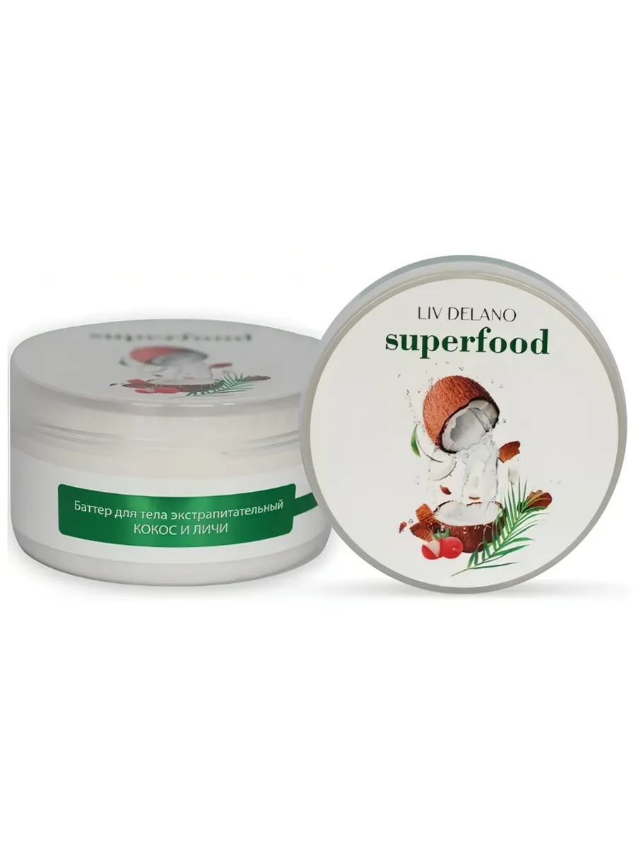 Superfood Extra-Nourishing Coconut and Lychee Body Butter. Superfood Extra-Nourishing Coconut and Lychee Body Butter from Belarusian brand Liv Delano is the perfect body cream, created to deeply moisturize and nourish your skin. This perfumed body butter combines natural oils and extracts, providing maximum care and imparting incredible softness. This delicate, rich-textured butter deeply nourishes, soothes, and softens rough areas of skin (elbows, knees, feet). This coconut body cream absorbs perfectly, evens out skin texture, imparts exquisite smoothness, and makes skin firmer and more elastic.