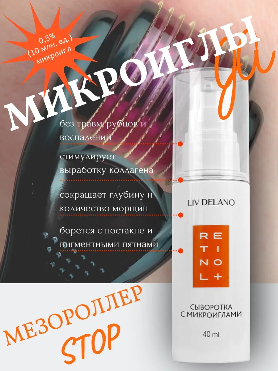 Сыворотка для лица с микроиглами Retinol+ 40 мл — инновационный продукт по уходу за кожей лица и зоны декольте. Сыворотка является прекрасной альтернативой использования мезороллера, но менее травматичной для кожи, и не вызывающей раздражения. Микроиглы — это микроскопические иголки морской губки, обладающие пористой структурой, за счет чего могут вбирать в себя питательные вещества и выступать как транспортное средство для полезных микроэлементов в более глубокие слои дермы, что обеспечивает доставку активных компонентов прямо в клетки кожи.