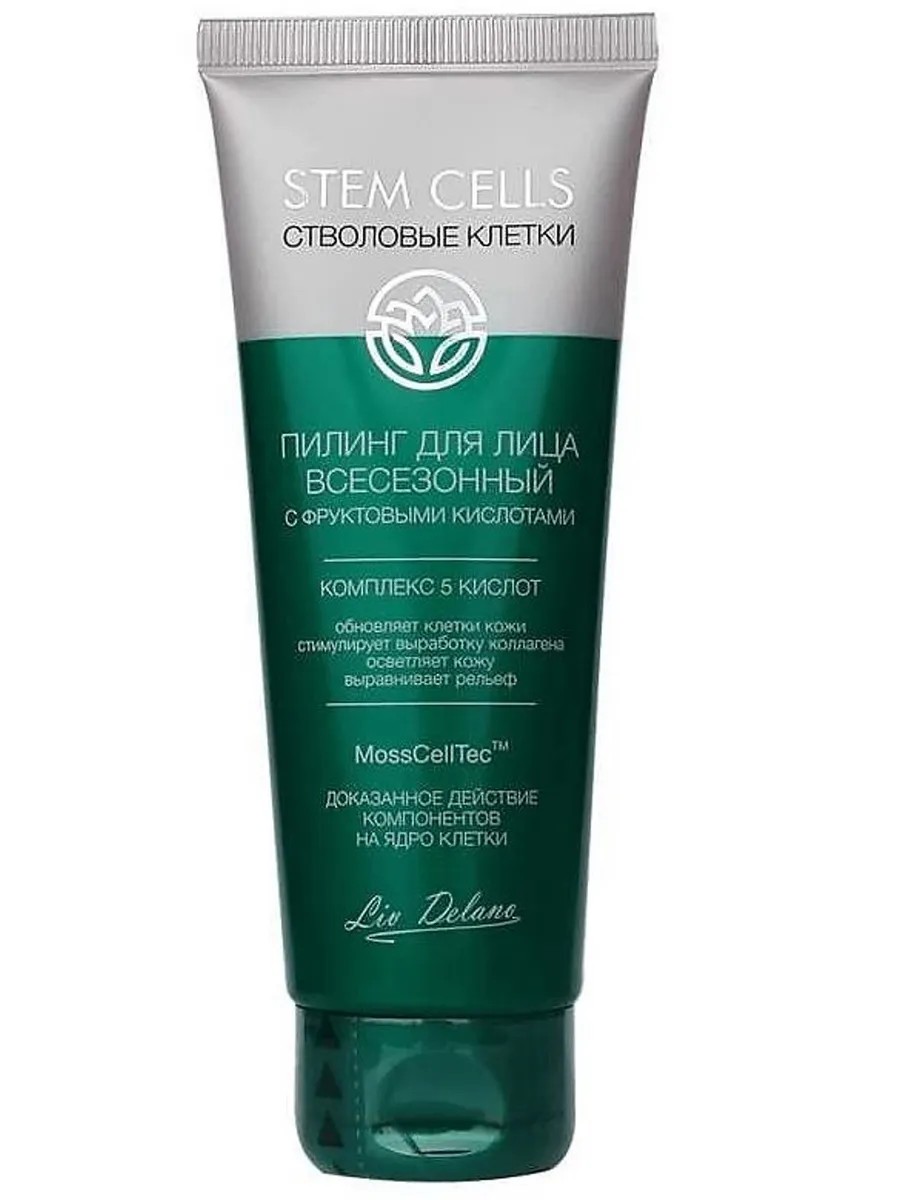 Liv Delano Пилинг для лица Stem Cells с фруктовыми кислотами, 75 г. Пилинг на основе пяти видов кислот создан для бережной эксфолиации ороговевших клеток и обновления кожи. Благодаря уникальному сочетанию ингредиентов средство оказывает мягкое отшелушивающее и омолаживающее действие. Активная формула способствует улучшению выработки коллагена и эластина, повышению упругости и эластичности кожи, выравниванию цвета лица, уменьшению чёрных точек и сужению пор. Подходит для всех типов кожи и для использования в любое время года. Комплекс 5 кислот Cobio-aha (гликолевая, винная, молочная, яблочная, лимонная) улучшает кожное дыхание и регенеративные процессы, ускоряет клеточный метаболизм, способствует осветлению пигментных пятен и уменьшению морщинок. Комплекс MossCellTec (стволовые клетки мха), поддерживает здоровье клеточных ядер для обеспечения молодости кожи; улучшает увлажненность кожи; совершенствует цвет и рельеф кожи; усиливает устойчивость кожи к городским факторам-агрессорам. Экстракт ананаса повышает тонус кожи, насыщает витаминами, активизирует процесс обновления клеток.