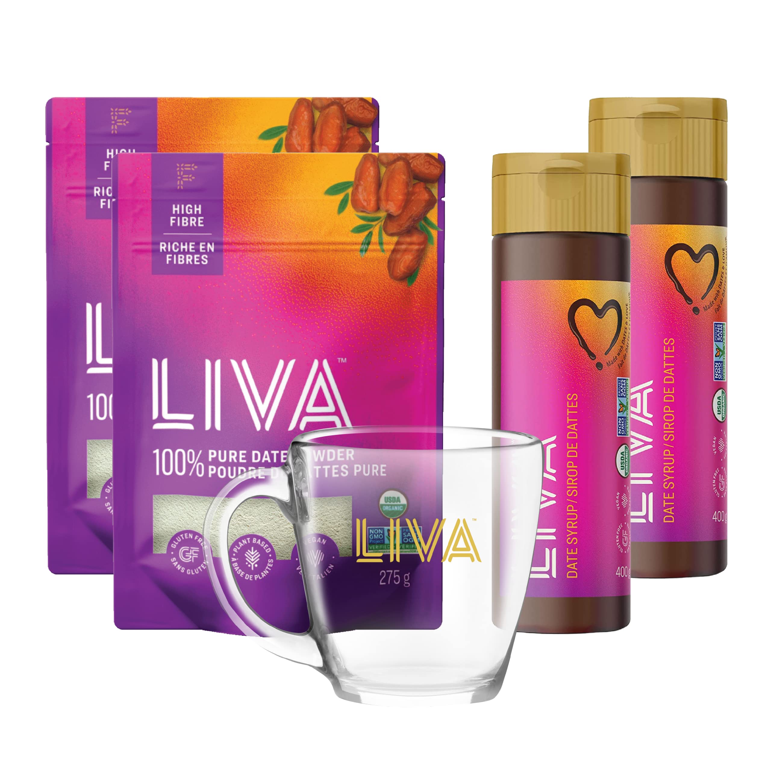 Naturally sweet and made from whole fruit, this bundle with delight and satisfy. With two bags of LIVA Date Powder and two bottles LIVA Date Syrup, you can baking, cook, and sweeten beverages with the natural deliciousness of dates! Also included in this bundle is a complimentary LIVA mug, perfect for hot and cold drinks with LIVA Date Syrup!MINORITY WOMEN OWNED AND OPERATED: We are a small business based in Ontario, Canada. Our Founder is a busy mother who is dedicated to bringing the world a healthier, kinder way to sweet. GOOD FOR THE PLANET: Our date syrup and date powder use only the ugly dates which are solar dried and prepared using 100 solar energy. We never use pesticides and we are certified non GMO and organic. HOW TO USE: Our date powder can be switched for other sugars in your beverages, smoothies, granola and baking. Switch 1-1.25 cups of LIVA for 1 cup of other sugar according to your preference for sweetness. TASTES SENSATIONAL: Our date syrup and date powder have a sweet mild caramel-like flavour which tastes great in everything!. GOOD FOR YOU: Our date syrup and date powder are a good source of fibre, vitamins and minerals, including potassium, magnesium, and iron. Nutritionists recommend it, as it can be helpful in controlling sugar spikes and blood sugar levels. NATURAL SWEETNESS: Our date syrup and date powder are natural whole-fruit sweeteners that are derived from 100 pure organic dates, making it a healthier alternative to refined sugar. It has absolutely zero fillers, additives or preservatives.
