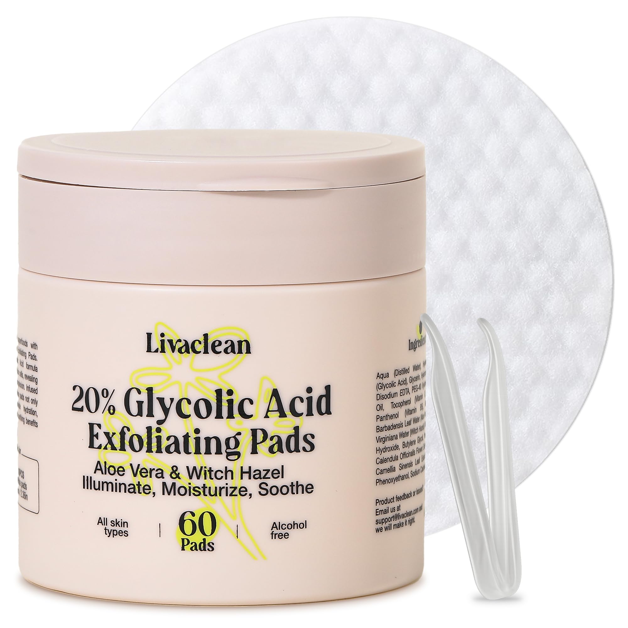 LivaClean 60 CT 20% Glycolic Acid Peel Pads with Aloe Vera Resurfacing Toner Pads for Face Exfoliating Wipes for Fine Lines Wrinkles Large Pores Textured Skin Includes Tweezer