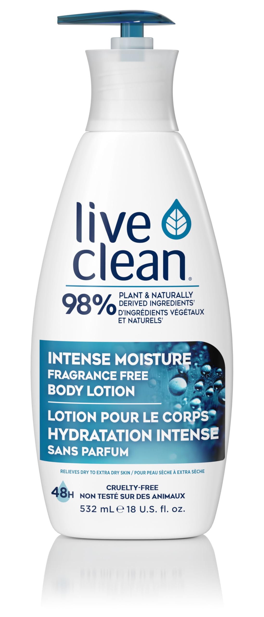 Live Clean Fragrance Free Intense Body Lotion is enriched with coconut oil and is perfect for extra dry skin. It's hypoallergenic and relieves skin with 48 hour hydration.