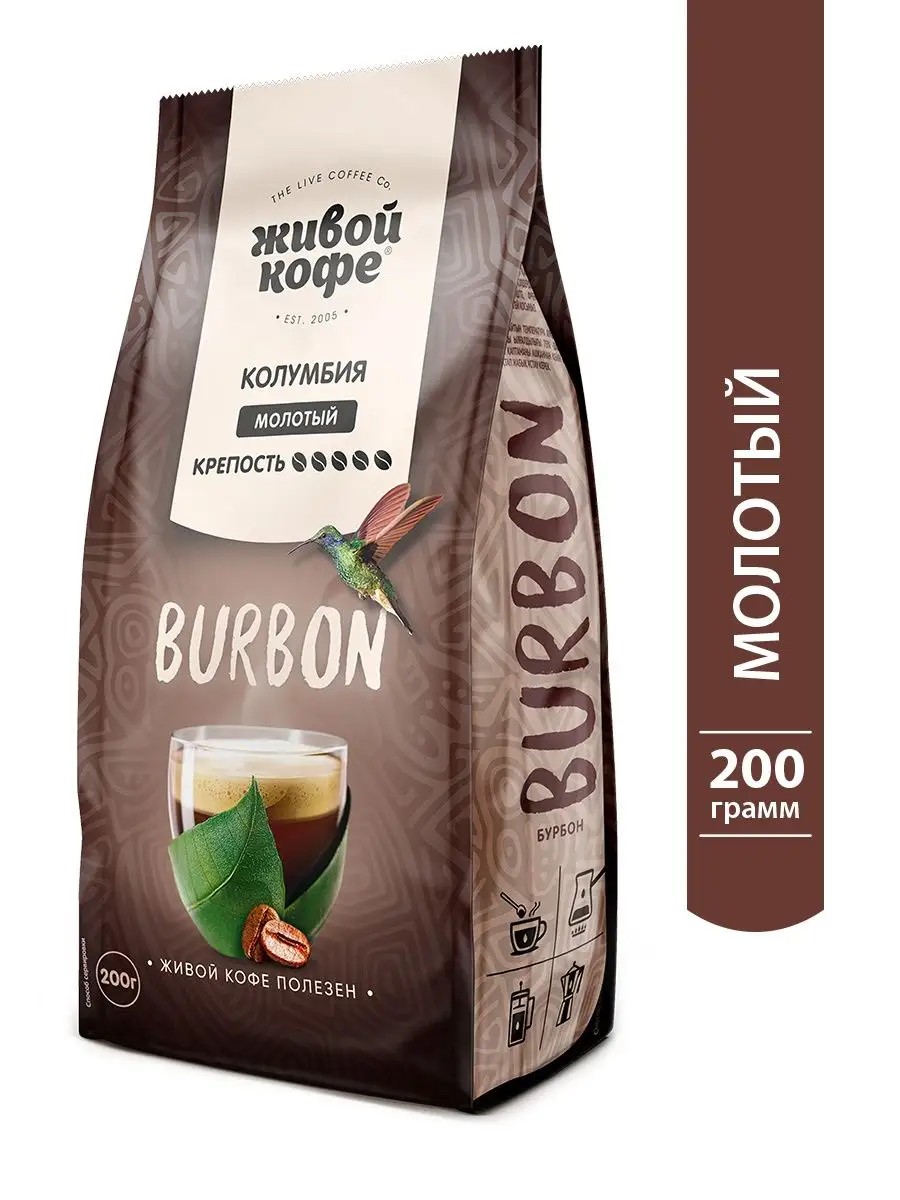 Живой Кофе Burbon включает в себя лучшие и редкие сорта колумбийского кофе сорта арабика. С целью уберечь нежнейшие кофейные деревья от палящих лучей Латиноамериканского солнца колумбийские фермеры высаживают их под более высокими деревьями коки. Период цветения кофе и коки совпадают. Считается, что они не опыляет друг друга, однако любители кофе признаются в том, что уже с первым глотком Burbona ощущают восхитительную энергетику. Кофе Burbon обладает сбалансированным вкусом и стойким ароматом.