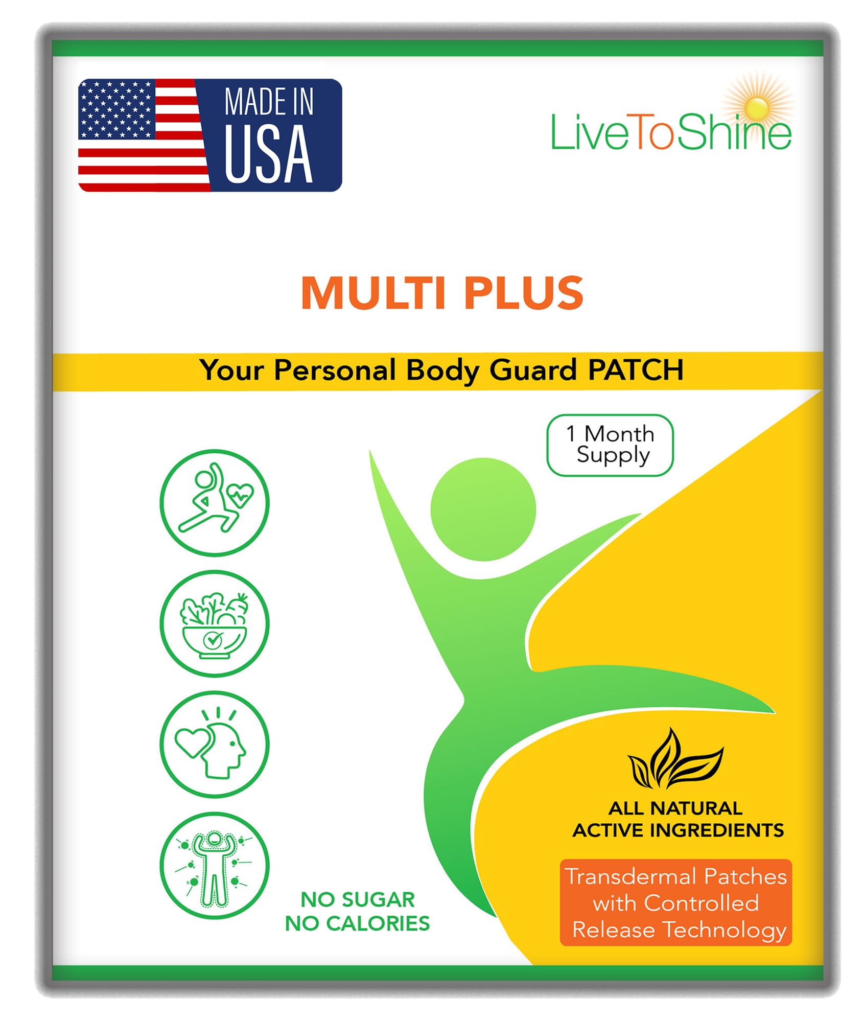 SUPERIOR PATCH FORMAT FOR ADULTS: No more gagging, no aftertaste, and no large pills. Our topical patch format offers a simple, convenient way to support your wellness routine without relying on the digestive process. Pair with our Calcium Magnesium Patch to build your personalized daily regimen - visit the Live to Shine Store for the complete USA-made collection. EASY "PEEL, STICK GO" ROUTINE: Apply to clean, dry, hair-free skin and wear for up to 12 hours. Includes 30 patches for a full month's supply. Perfect for travel, busy mornings, or anyone who struggles with swallowing pills. CLEAN, SAFE SUGAR-FREE: Vegan, non-GMO, and free from sugar, gluten, lactose, soy, parabens, sulfates, artificial dyes, and synthetic fragrances. No latex. No questionable fillers. A clean, worry-free option compared with many low-cost imported patches flooding the category. DAILY WELLNESS SUPPORT FOR BUSY LIVES: Designed to support everyday energy, general immune support, and overall wellness as part of your daily routine. A simple, time-saving alternative for adults who want steady support without gummies, pills, or powders. PREMIUM USA MANUFACTURING: Proudly crafted in a registered American facility with the highest ingredient and manufacturing standards. Live to Shine has delivered over 2 million premium patches nationwide. Every pack displays our MADE IN USA seal so you always know what you're getting—QUALITY, CONSISTENCY AND PEACE OF MIND.