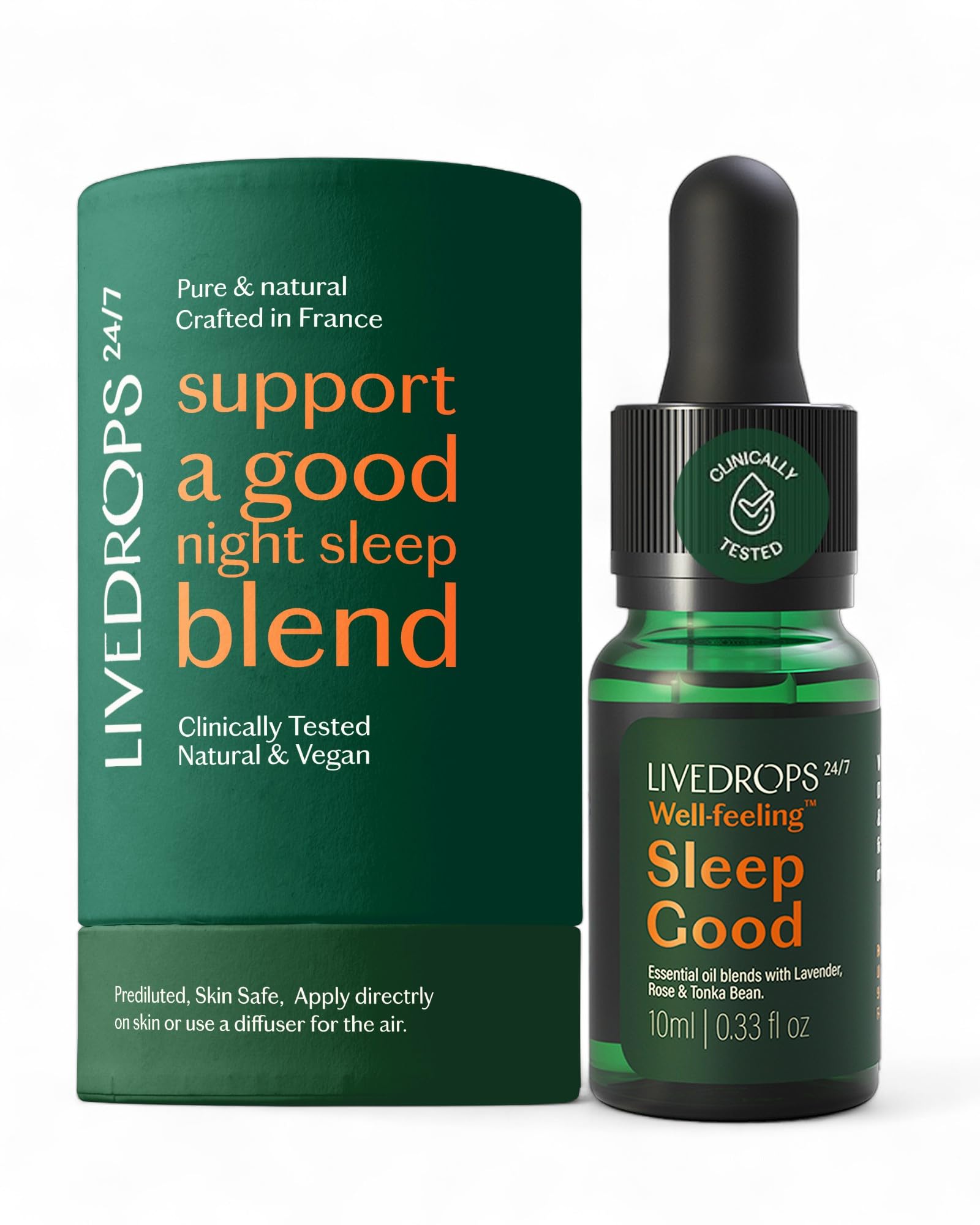 : Livedrops 24 7 uses only trusted premium and pure ingredients applying stringent quality checks from source to bottling to ensure no contamination?. All Well-feeling variants have been clinically tested under the supervision of a board-certified dermatologists. Safety of use: To make all Livedrops 24 7 essenital oil blends safe, gentle, and ready to use directly on your skin. No mixing or guessing required. Essential oil harnesses nature's potency. Clinically tested verified oils for intended uses e.g. on skin or in a diffuser. Thoughtfully pre-diluted with high-quality, responsibly sourced vegetable oil. Dipteryx Odorata bean is prized for its rich, sweet and warm fragrance. A popular ingredient in perfumery and in culinary. Its warm scent is known for soothing properties. Rose (Rosa Damascena) from Turkey, referred to as the queen of flowers. Considered one of perfumery's most beautiful materials with it's soft elegant scent. The scent is known for it's relaxing properties. Main Ingredients: Lavender Oil from Bulgaria: Known for it's purity and centuries-old farming practices. Hydro distillation extraction from stems and Flowers. Complex herbaceous with a rich floral scent. Known for it's calming properties. Supported by science. Collaborating with leading neuroscientists and academics. Using scientific methods to reveal the power of natural scents to connect with your emotions Well-feeling. Crafted in France. Vegan-friendly. Pure Natural. Clinically tested under the supervision of a board-certified dermatologists. Child-resistant packaging. Skin Safe Diffuser Compatible. Easy to Use: Apply to pulse points, temples, or diffuse before bed. Can be used on wrists or added to your nighttime skincare ritual for a moment of calm. with the floral soothing scent of Sleep Good ?Essential Oil Blend. Bulgarian Lavender, Rose, and Dipteryx Odorata Tree. Crafted to support a good night sleep wake up refreshed. Great for bedtime rituals, meditation, or post-screen-time wind down.