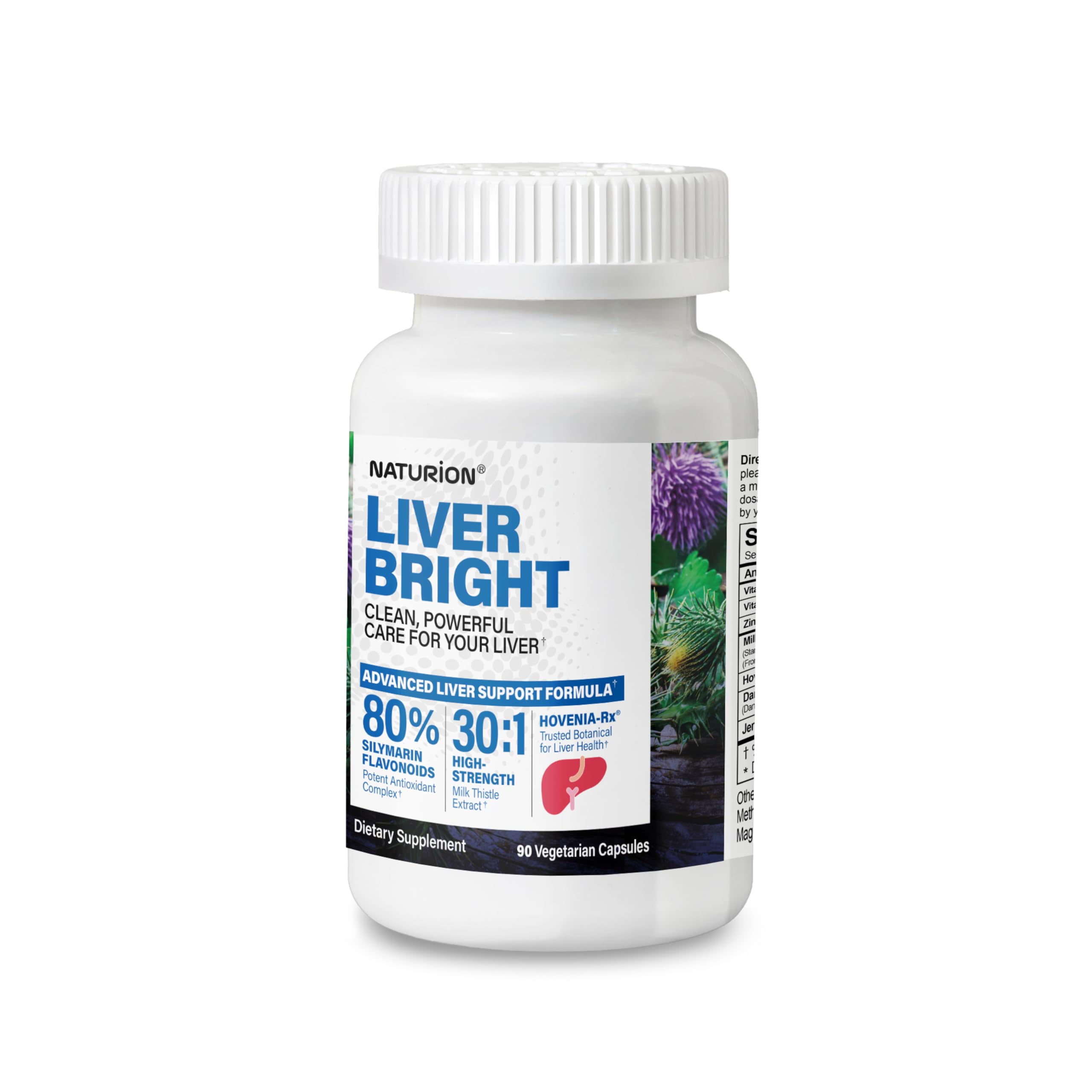LIVER BRIGHT Milk Thistle formula offers a potent 30:1 extract, delivering the strength of 7,500 mg of whole herb per capsule, standardized to 80 silymarin flavonoids — a bioactive compound recognized for its antioxidant activity. In addition to Milk Thistle, this formula features Hovenia dulcis fruit extract (Hovenia-Rx) and Dandelion root extract (10:1), traditional botanicals known to promote general wellness. Combined with Zinc, Vitamin B5, and Vitamin E, it supports immune function, energy production, and cellular protection from oxidative stress. Every batch of Naturion Milk Thistle is produced in a facility that follows Good Manufacturing Practice (GMP) guidelines, ensuring a commitment to purity, potency, and quality. Our clean formula is 100 vegetarian and free from artificial colors, flavors, and preservatives — ideal for those seeking a plant-based supplement they can trust. Each bottle contains 90 vegan capsules, providing a 3-month supply when taken as directed.Produced in a Facility Following GMP Guidelines: Manufactured in a facility that strictly follows Good Manufacturing Practice (GMP) guidelines to ensure product quality, safety, and consistency. 100 Vegan, Clean Formula: Our formula is non-GMO, vegan-friendly, and free from gluten, dairy, soy, artificial colors, flavors, and preservatives. Made with vegetable capsules suitable for plant-based lifestyles. Essential Micronutrients for Daily Support: Includes Zinc (11 mg, 100 DV), Vitamin B5 (300 DV), and Vitamin E (420 DV) — nutrients that play important roles in cellular health and energy metabolism. . Unique Herbal Blend with Hovenia-Rx and Dandelion: Formulated with Hovenia dulcis fruit extract (Hovenia-Rx) and Dandelion root extract (10:1), both traditionally used to support overall wellness and vitality. . High Potency 30:1 Milk Thistle Extract: Each capsule contains the equivalent of 7,500 mg of raw Milk Thistle herb, standardized to 80 silymarin flavonoids, a key bioactive compound known for its antioxidant properties.