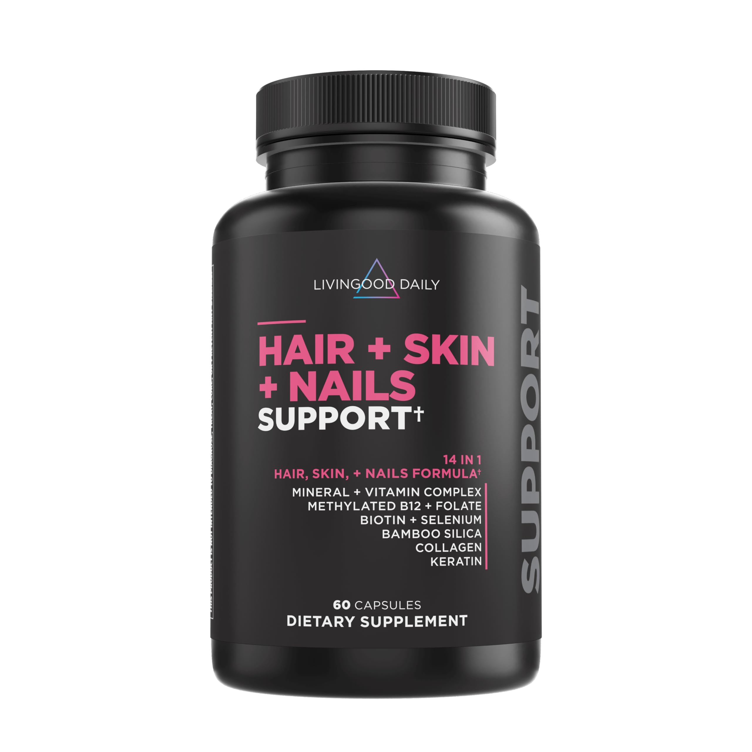 SUPPORTING EVERYDAY WELLNESS: Livingood Daily supplements are thoughtfully formulated with quality, purpose-driven ingredients to support your health journey. Each product reflects our commitment to real ingredients, practical solutions, and a daily approach to wellness—designed to help you live good, every day. CLEAN, GLUTEN FREE FORMULA: Made without artificial additives, fillers, or common allergens. This non GMO supplement is gluten free and made with carefully selected ingredients. Take 2 capsules daily for a clean, reliable beauty routine. SUPPORTS HAIR, SKIN NAIL STRENGTH: Crafted to help maintain elasticity, hydration, and structure, this supplement provides nutrients that work together to support smoother skin, fuller hair, and durable nails. VITAMINS MINERALS FOR DAILY CARE: Features a unique blend of essential nutrients including bamboo silica, zinc, copper, and saw palmetto to promote cellular health and natural skin hydration in men and women. 14-IN-1 BEAUTY FORMULA: This powerful supplement includes biotin, collagen, keratin, folate, selenium, methylated B12, and more to support healthy, glowing skin, strong nails, and vibrant hair from the inside out.