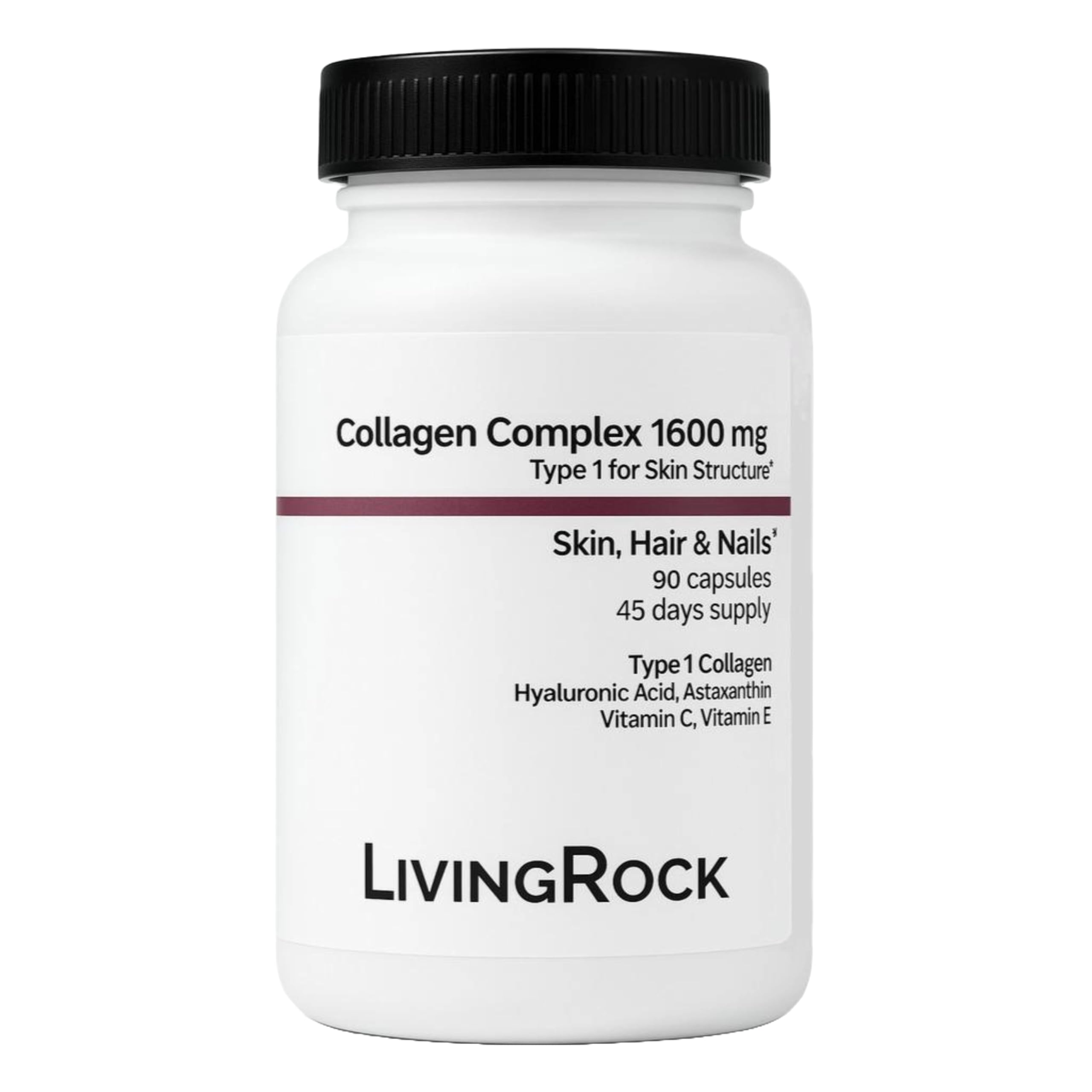 LivingRock Collagen Complex 1600mg with Type I Marine Collagen Hyaluronic Acid Astaxanthin Vitamin C & E Natural Multi-Ingredient Formula 90 Vegetable Capsules 45-Day Supply