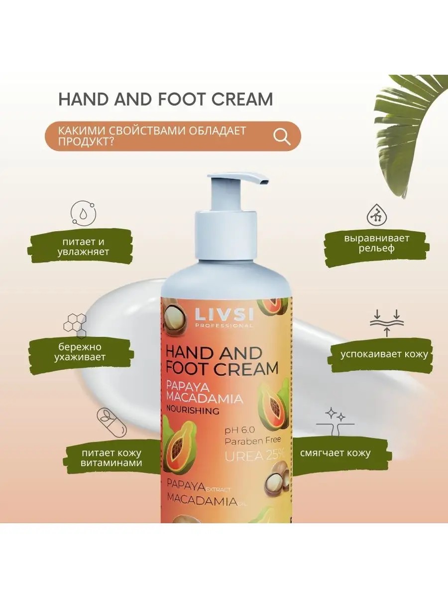 UREA 25% Hand and Foot Cream (Papaya and Macadamia), 200 ml. Nourishes and moisturizes, evens out skin texture, and gently cares for it; it soothes and softens the skin. Macadamia essential oil relieves skin irritation and rash. Urea softens and smoothes the skin. Sunflower oil draws moisture from the deep layers of the skin, helping the epidermis absorb nutrients. Papaya extract evens out skin texture and stimulates skin regeneration. Sea buckthorn extract has a nourishing, anti-inflammatory, and regenerating effect. Words: milk, lotion, skin care product, liquid, moisturizing, super-hydrating, hydrating, cleansing, women's, protective, decorative, cosmetic, tonic, for teenagers, bottle, all skin types, oily, dry, problematic, sensitive, lotion, spray, professional, preparation, bath, shower, gift, mini, smooth, natural, massage, dryness, nourishing, soothing, fruit, inexpensive, antibacterial, scented, soft, homemade, for hands, feet, skin, professional.