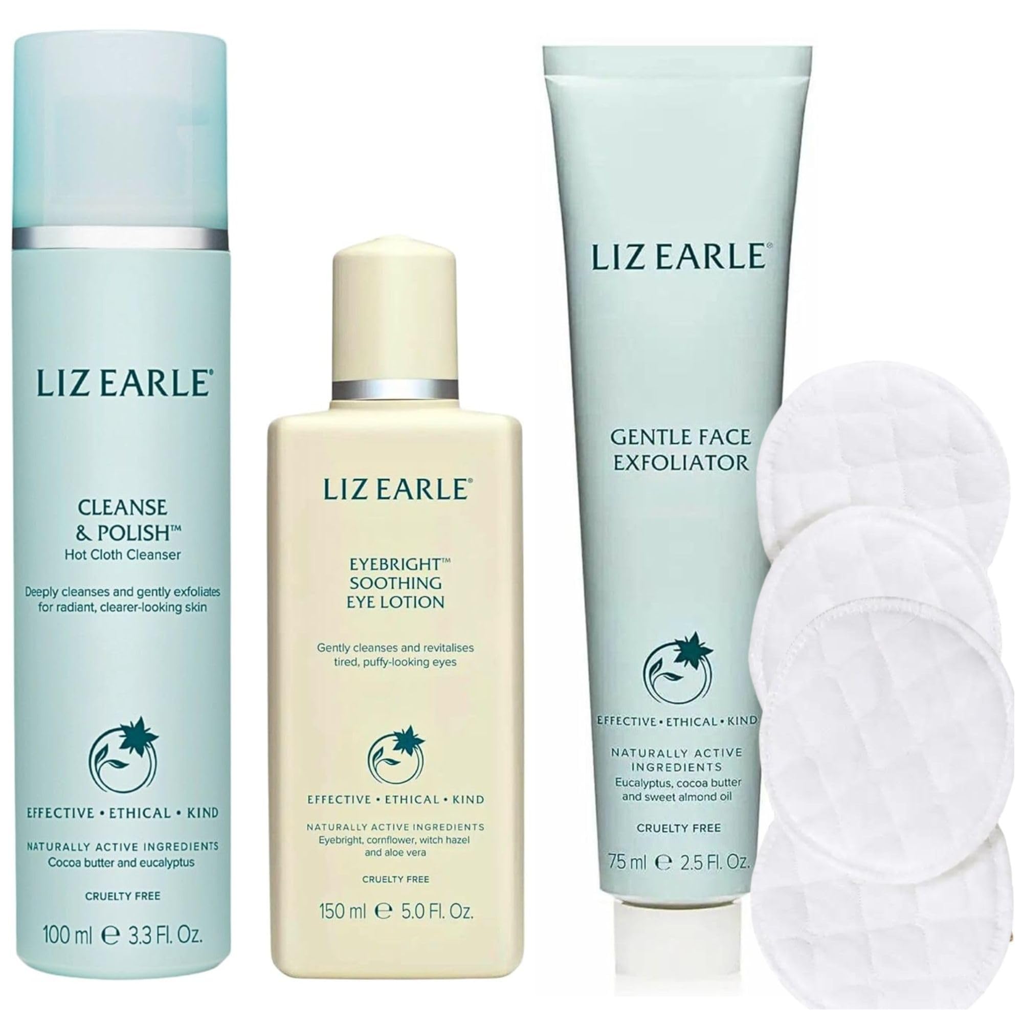 Liz Earle Essential Skincare Set: Elevate your daily skincare ritual with the Liz Earle Essential Set. Designed to bring out your natural glow, this set starts with the renowned Liz Earle Cleanse & Polish, a hot cloth cleanser that deeply purifies and refreshes. Follow with the Gentle Face Exfoliator to unveil a smooth, radiant complexion. Revive tired eyes with the Eyebright Soothing Eye Lotion, a rejuvenating formula inspired by the essence of Eyebright. To ensure an eco-friendly experience, this set also includes four reusable cotton pads. Whether you're gifting or indulging for yourself, this curated collection is the epitome of skincare luxury. INGREDIENTS Aqua (Water), Caprylic/Capric Triglyceride, Theobroma Cacao (Cocoa) Seed Butter, Jojoba Esters, Cetearyl Alcohol, Cetyl Esters, Glycerin, Cera Alba (Beeswax), Sorbitan Stearate, Polysorbate 60, Eucalyptus Globulus Leaf Oil, Prunus Amygdalus Dulcis (Sweet Almond) Oil, Phenoxyethanol, Panthenol, Benzoic Acid, Dehydroacetic Acid, Limonene, Sodium Hydroxide, Ethylhexylglycerin, Citric Acid.Complete Skincare Kit: This essential set of Liz Earle cleanser, face exfoliator, and the soothing eye lotion, along with 4 reusable cotton pads, it's a comprehensive package for all skincare needs. Liz Earle Cleanse & Polish: Dive into the luxury of the Liz Earle hot cloth cleanser, formulated to provide a deep cleanse and polish, ensuring radiant and refreshed skin with every use. Gentle Face Exfoliator: Unveil smoother skin with the Liz Earle face exfoliator. Crafted with care, it gently exfoliates to reveal a brighter complexion, ideal for routine skincare. Eyebright Soothing Lotion: The Liz Earle Eyebright Soothing Eye Lotion is a must-have for tired eyes. Infused with the benefits of Liz Earle Eyebright, it refreshes and rejuvenates, making it perfect for daily use. Complete Skincare Routine. This set includes 3 essential Liz Earle skincare products: 1 X Liz Earle Cleanse & Polish 100ml, 1 X Liz Earle Gentle Face Exfoliator 75 ml, 1 X Liz Earle Eyebright Soothing Eye Lotion and 4 Reusable Cotton Pads.