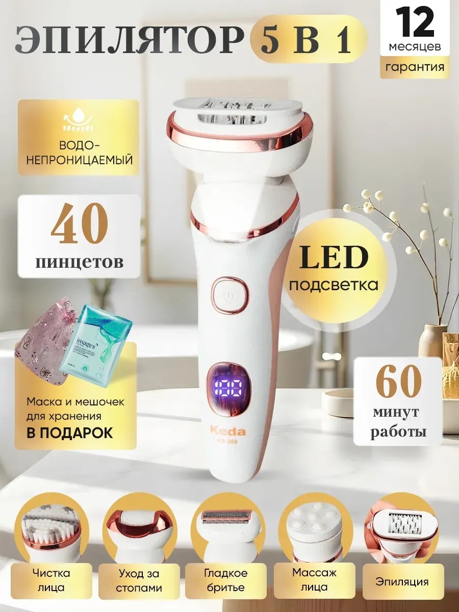 Хотите купить эпилятор для эффективной и безболезненной эпиляции? Электрический беспроводной прибор бренда PROKVEL идеально подходит для удаления волос на ногах и теле. С этим компактным и многофункциональным устройством вы сможете убрать нежелательные волоски в домашних условиях без раздражений. Благодаря встроенному аккумулятору и USB - зарядке его можно использовать в любом месте - и дома, и в дорожных условиях. В наборе эпилирующая головка с 40 пинцетами, насадка для шлифовки и массажный роликовый массажер, а также электробритва и массажная головка - щеточка, которые позволят добиться гладкой и нежной кожи. Электроэпилятор с LED - подсветкой идеален для деликатной депиляции чувствительных участков - интимных зон бикини, лица, подмышек и сухого ухода за кожей стоп и пяток. Вы можете использовать эту машинку для бритья вместо обычного бритвенного станка. Многоразовый универсальный инструмент предотвращает появления вросших волосков и гарантирует точность работы. Портативный многофункциональный девайс с перезаряжаемой батареей имеет водонепроницаемый корпус, поэтому он может удалять волосы в душе. Уход за здоровьем и красотой как в салоне - это легко с нашим аккумуляторным аппаратом для электроэпиляции. Такая электронная бытовая техника, в комплекте с которой идут сменные насадки для массажа, пилинга и ухода за пяточками, а также щетка для чистки и шнур для зарядки от розетки электрического питания, - это идеальный женский бьюти - гаджет, который подарит коже нежность и поможет замедлить рост волос. Такой подарочный набор - отличное решение для презента дорогой вам девушке или женщине. Заверните его в красивую упаковку, дополните уходовым средством и порадуйте вашу любимую! Вы можете преподнести этот набор своей жене на годовщину свадьбы, матери на юбилей, девушке на Новый год или младшей сестре на день рождения. У нас есть акции и распродажи, вы можете купить наши товары в подарок или со скидкой!