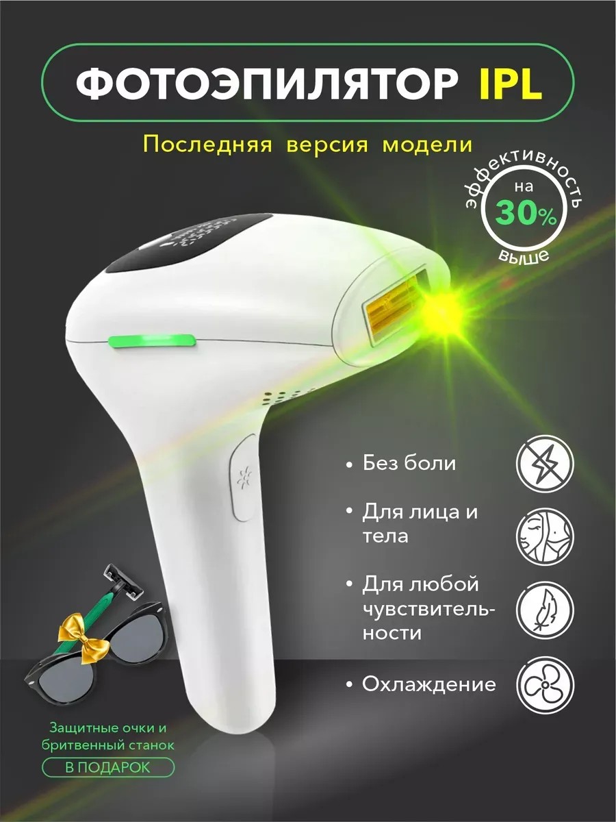Инструкция по QR-коду на фото. Лазерный фотоэпилятор - это инновационный профессиональный аппарат, который позволяет удалить нежелательные волосы на долгое время безболезненно в домашних условиях и сэкономить время и деньги на посещение салонов. Он оснащен технологией IPL, которая используется для эпиляции без механических воздействий. Помимо удаления волос, свет может стимулировать выработку коллагена и эластина, повысить тонус и упругость кожи, снизить воспаления, угревую сыпь и воздействовать на регенерацию тканей. Электрический мини эпилятор может использоваться для тела, рук и ног, зон бикини и интимных мест, подмышек, лица. Но не подходит для удаления волос бровей, волос головы, мужских бороды и усов. Безболезненно эпиляция проходит у людей с черными и темно-коричневыми волосами и светлой кожей. Нельзя использовать людям с темно-коричневой и черной кожей, не подходит для удаления седых, рыжих и светло-русых волос. В отличие от депиляции воском или электроэпилятором, лазерная эпиляция не вызывает боли и раздражений, имеет долгосрочный эффект. Нужно понимать, что для достижения полного удаления волос необходимо время и проведение серии процедур, но видимый результат уже появится после 4-й недели. (!) Важно ознакомиться с инструкцией перед использованием, чтобы определить тип кожи, ограничения и рекомендации. Депилятор, при увеличенной эффективности, имеет ресурс в 500 тысяч вспышек, что позволяет быстрее получить результат. 5 режимов мощности позволяют использовать аппарат при разном уровне чувствительности кожи. Площадь светового окошка кварцевой лампы в 3 см² дает возможность обрабатывать маленькие участки. Для удобства есть ручной (для небольших поверхностей) и автоматический режимы работы. Датчик прикосновения предотвращает холостые вспышки без контакта с кожей. В комплекте с аппаратом поставляются специальные очки для лазерной эпиляции и бритва для подготовки к процедуре. Лазерный фотоэпилятор станет оригинальным подарком на Новый год и другие праздники